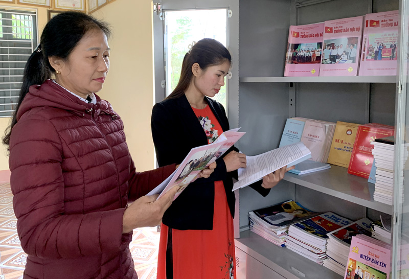 trên các ấn phẩm báo chí, sách ở tủ sách của thôn. Ảnh: Lý Thịnh