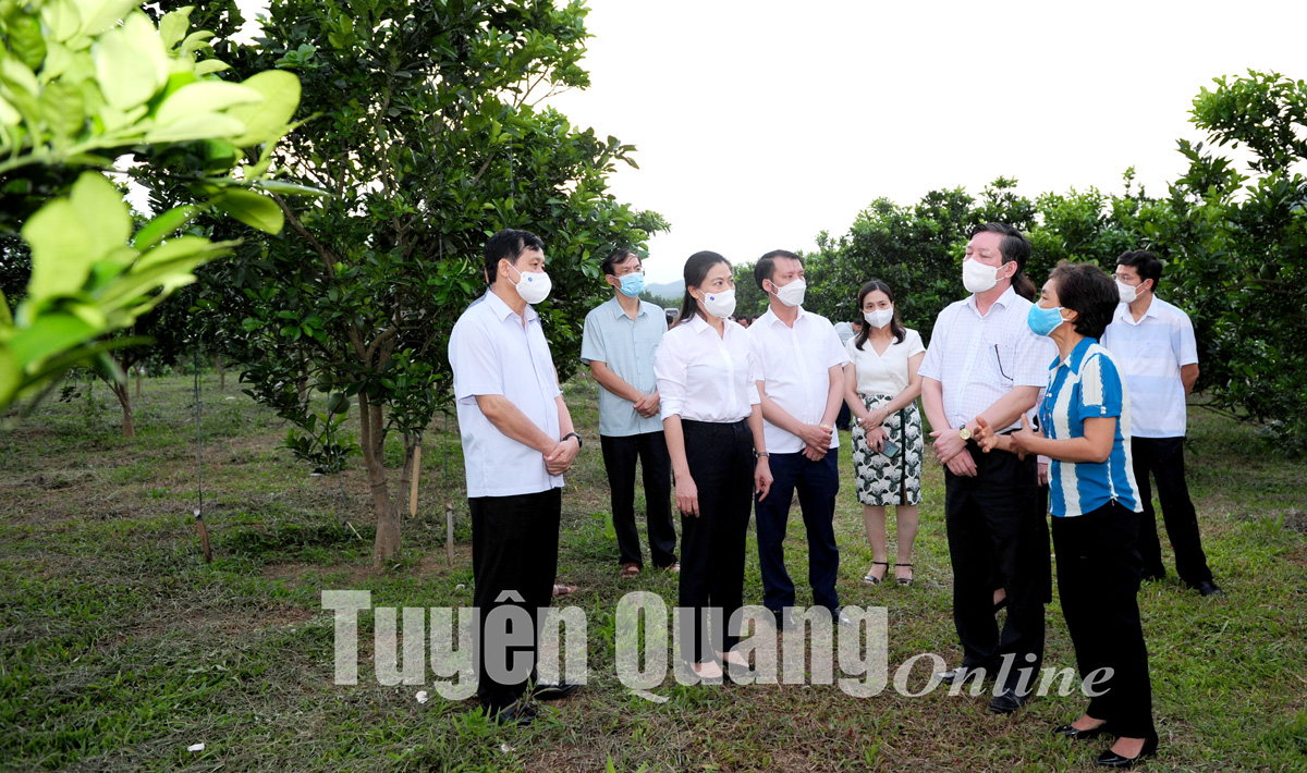 Đồng chí Lê Thị Kim Dung, Phó Bí thư Thường trực Tỉnh ủy, Chủ tịch HĐND tỉnh thăm mô hình bưởi hữu cơ
