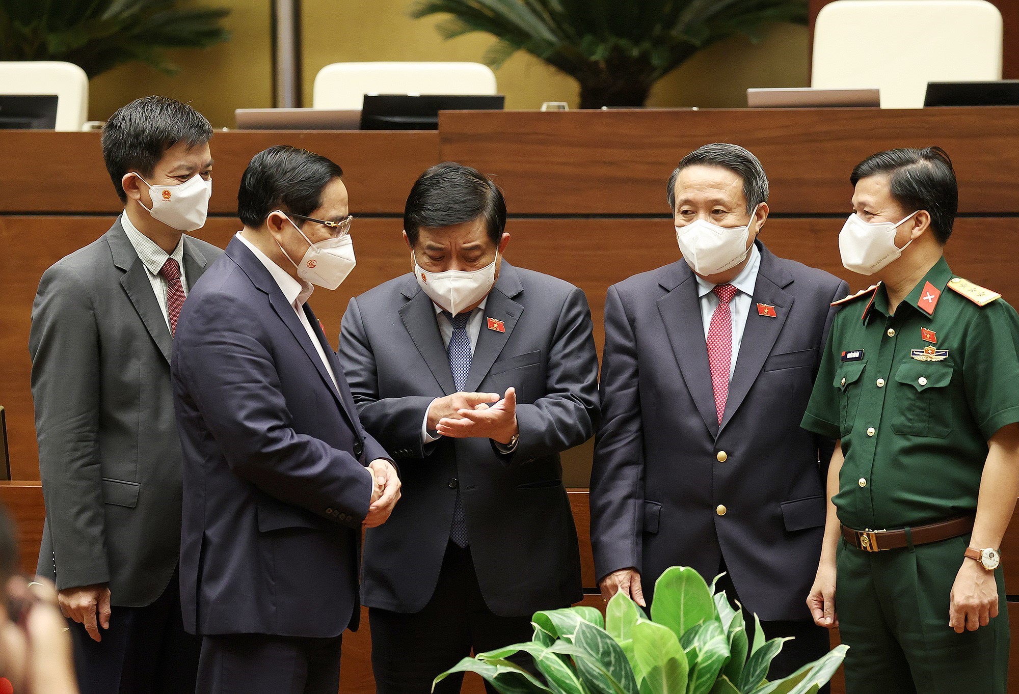 Ủy viên Bộ Chính trị, Thủ tướng Chính phủ Phạm Minh Chính trao đổi với các đại biểu bên lề phiên họp Quốc hội thảo luận về kế hoạch phát triển kinh tế - xã hội, ngân sách nhà nước _Ảnh: TTXVN _Ảnh: TTXVN