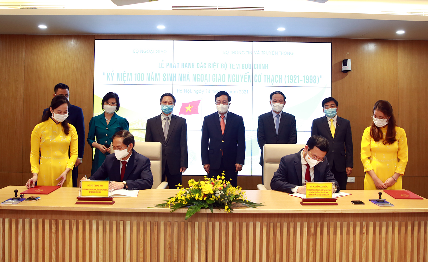 Bộ trưởng Bộ TT&TT Nguyễn Mạnh Hùng và Bộ trưởng Bộ Ngoại giao Bùi Thanh Sơn ký phát hành bộ tem - Ảnh: VGP/Hải Minh