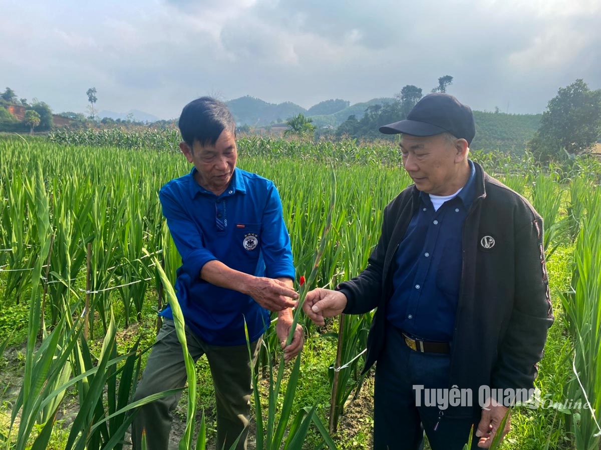Đảng viên Trần Ngọc Dư, Phó Bí thư chi bộ thôn Hoàng Sơn, xã Chân Sơn (Yên Sơn) - người đứng bên trái, gương mẫu đi đầu chuyển đổi cơ cấu cây trồng, phát triển kinh tế gia đình.