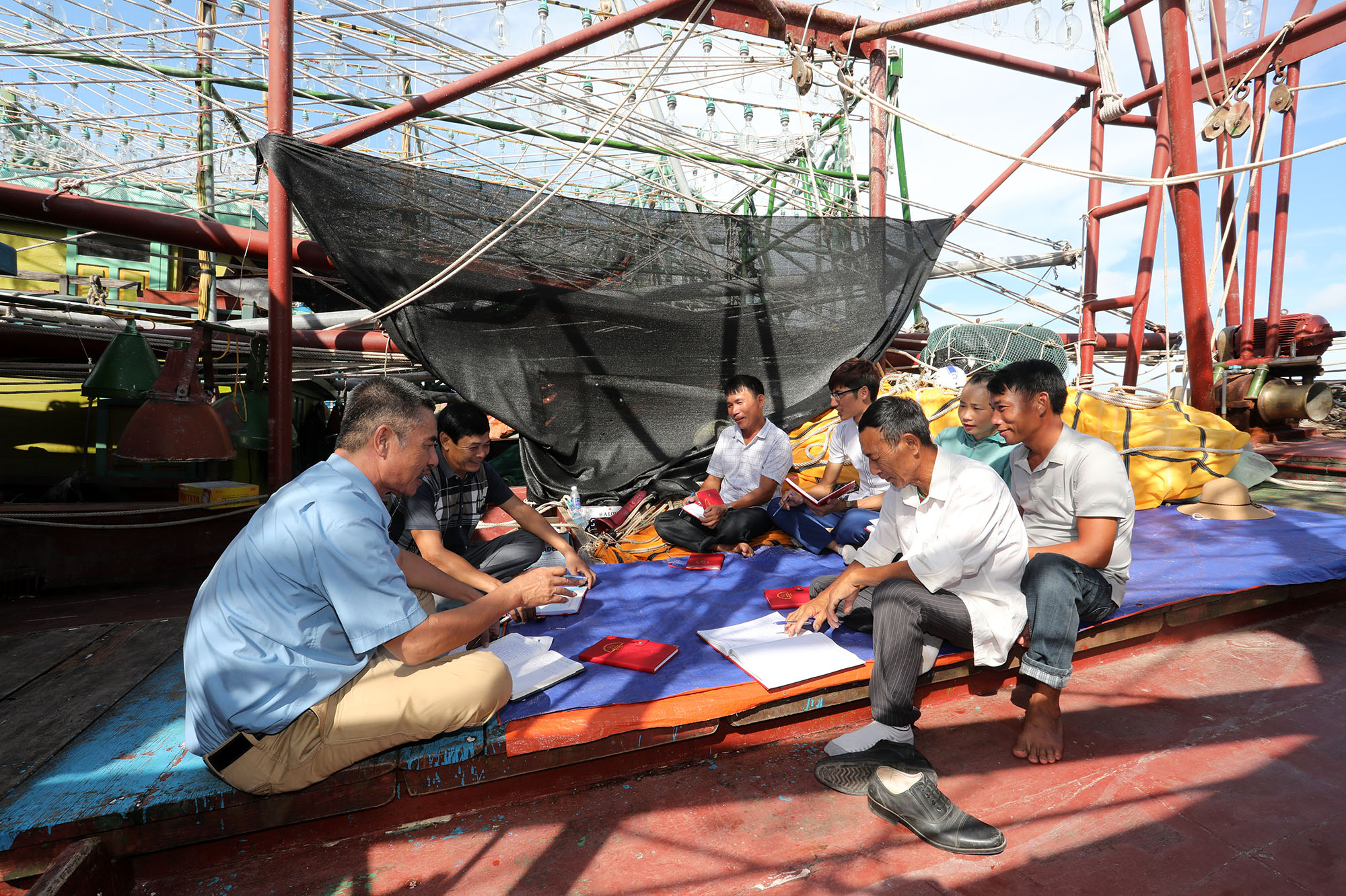 Buổi sinh hoạt chi bộ của Chi bộ 4, xã Đường Hoa, huyện Hải Hà, tỉnh Quảng Ninh được tổ chức trên chính phương tiện khai thác của bà con ngư dân trong những chuyến vươn khơi bám biển_Nguồn: baoquangninh.com.vn
