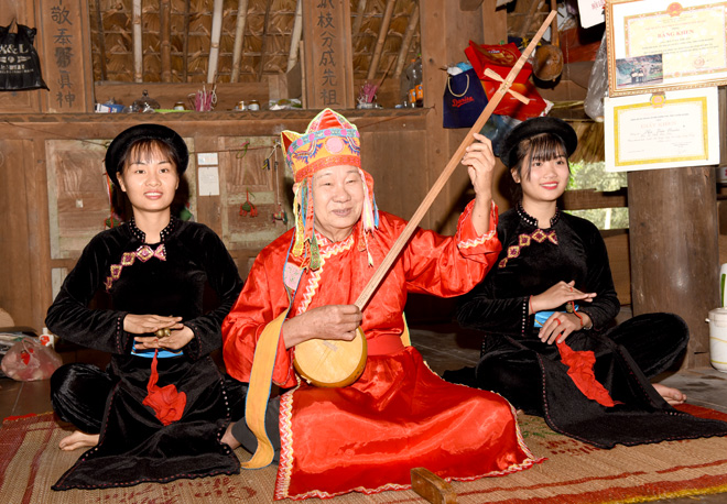 Nghệ nhân Hà Thuấn, xã Tân An, Chiêm Hóa truyền dạy then cho thế hệ trẻ. Ảnh: Quốc Việt
