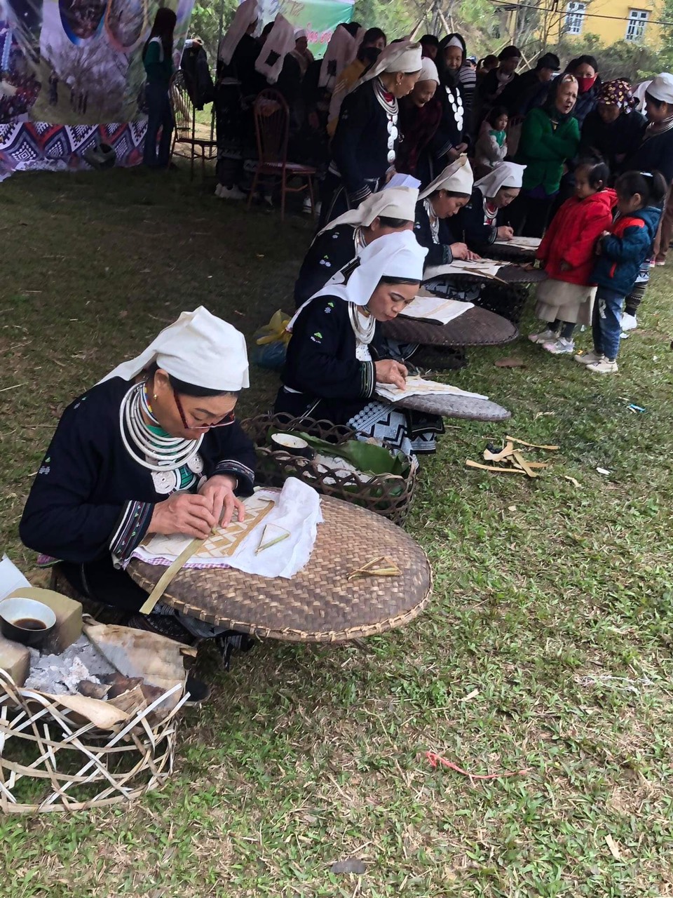 Phụ nữ Dao Tiền (xã Hồng Thái, huyện Na Hang) tại Hội thi Thêu khăn, vẽ áp ong trên trang phục người Dao Tiền