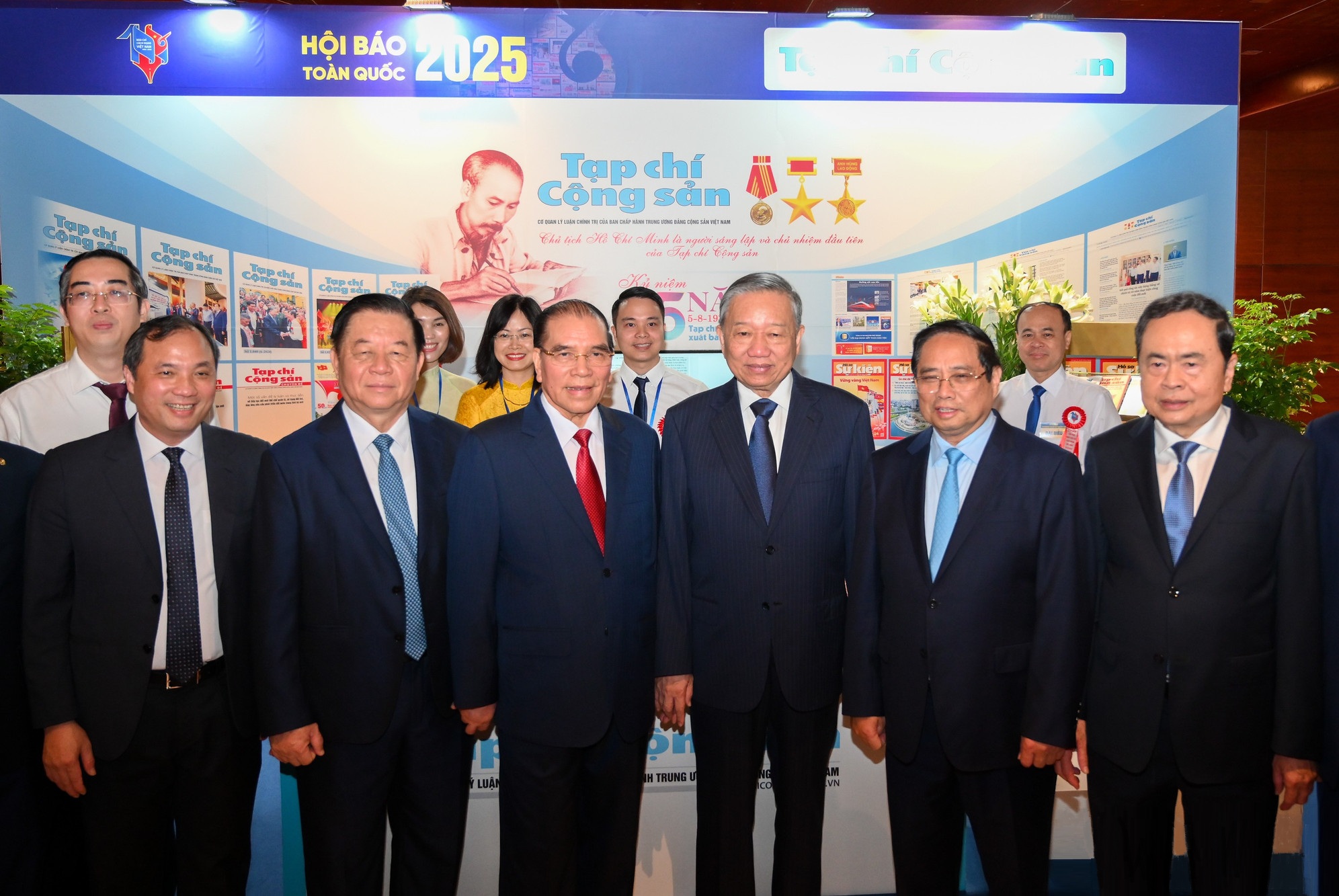 Tổng Bí thư Tô Lâm cùng các đồng chí lãnh đạo Đảng, Nhà nước và đại biểu tham quan không gian trưng bày của Tạp chí Cộng sản tại Hội báo toàn quốc 2025_Ảnh: nhandan.vn