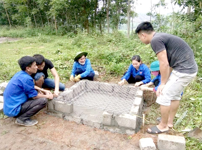 Đoàn Thanh niên xã Phúc Thịnh hỗ trợ người dân thôn An Thịnh xây hố rác thải gia đình.