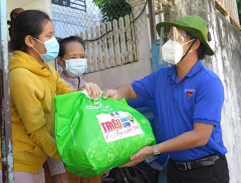 Tỉnh đoàn Khánh Hòa tặng nhu yếu phẩm giúp người dân và sinh viên các khu trọ tại Vĩnh Phước, thành phố Nha Trang trong những ngày giãn cách xã hội_Ảnh: TTXVN