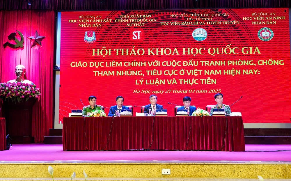 Các đồng chí chủ trì Hội thảo khoa học cấp quốc gia “Giáo dục liêm chính với cuộc đấu tranh phòng, chống tham nhũng, tiêu cực ở Việt Nam hiện nay - Lý luận và thực tiễn”, ngày 27-3-2025 _ Nguồn: hvannd.edu.vn