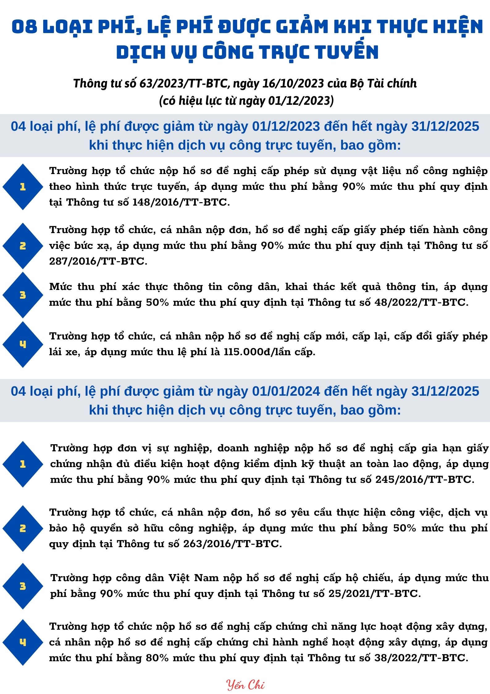 Ngày 16/10/2023 Bộ Tài chính ban hành Thông tư số 63/2023/TT-BTC sửa đổi, bổ sung một số điều của một số Thông tư quy định về phí, lệ phí của Bộ trưởng Bộ Tài chính nhằm khuyến khích sử dụng dịch vụ công trực tuyến, trong đó quy định 08 loại phí, lệ phí được giảm khi thực hiện dịch vụ công trực tuyến như sau: