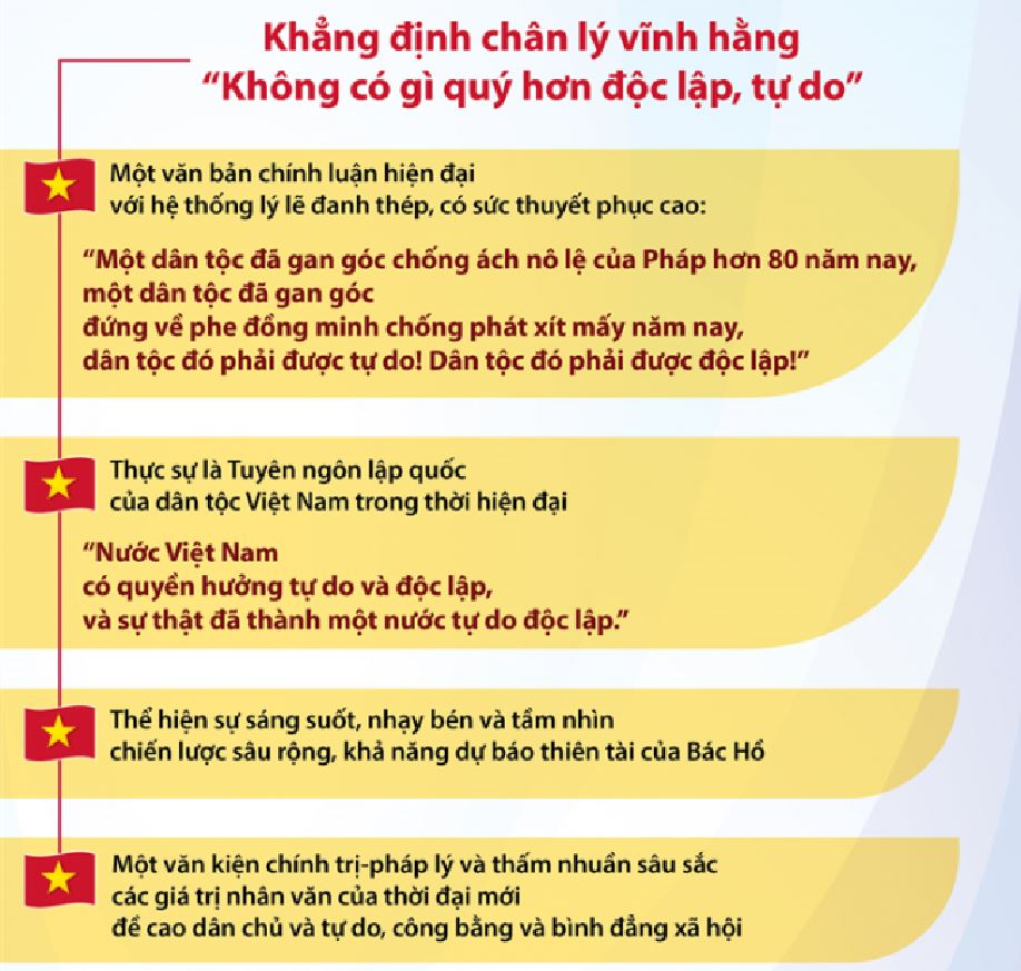 77 năm sau ngày Chủ tịch Hồ Chí Minh viết và đọc Tuyên ngôn Độc lập, mỗi người dân Việt Nam càng thấy thấm thía hơn giá trị của độc lập, tự do; ý nghĩa lớn lao và sâu sắc tư tưởng Hồ Chí Minh về quyền con người và quyền của mỗi dân tộc.