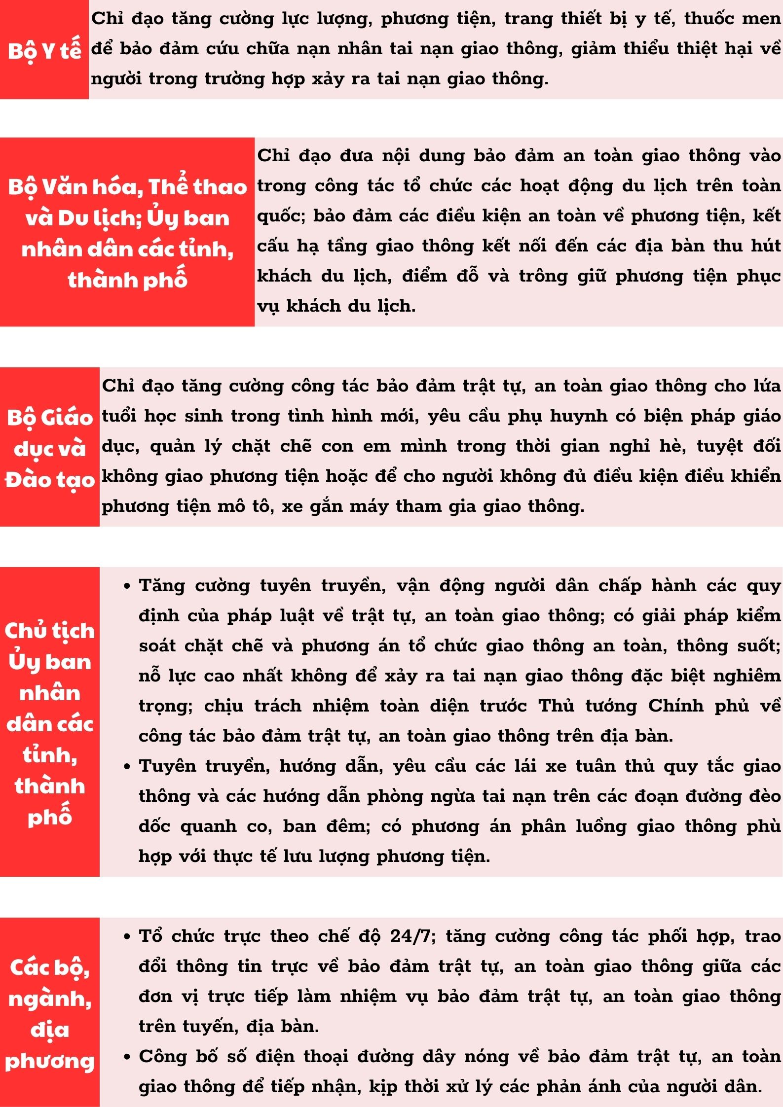 Theo Công điện số 36/CĐ-TTg, ngày 11/4/2024 của Thủ tướng Chính phủ về bảo đảm trật tự, an toàn giao thông phục vụ nhu cầu đi lại của Nhân dân dịp nghỉ lễ 30/4 - 1/5 và cao điểm du lịch hè 2024.