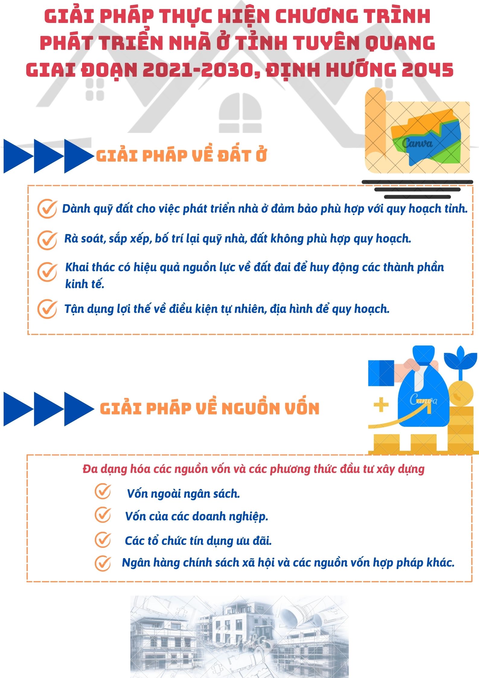Ngày 20/10/2023 Hội đồng nhân dân tỉnh ban hành Nghị quyết số 39/NQ-HĐND về Chương trình phát triển nhà ở tỉnh Tuyên Quang giai đoạn 2021 - 2030, định hướng 2045, trong đó nêu giải pháp thực hiện như sau: