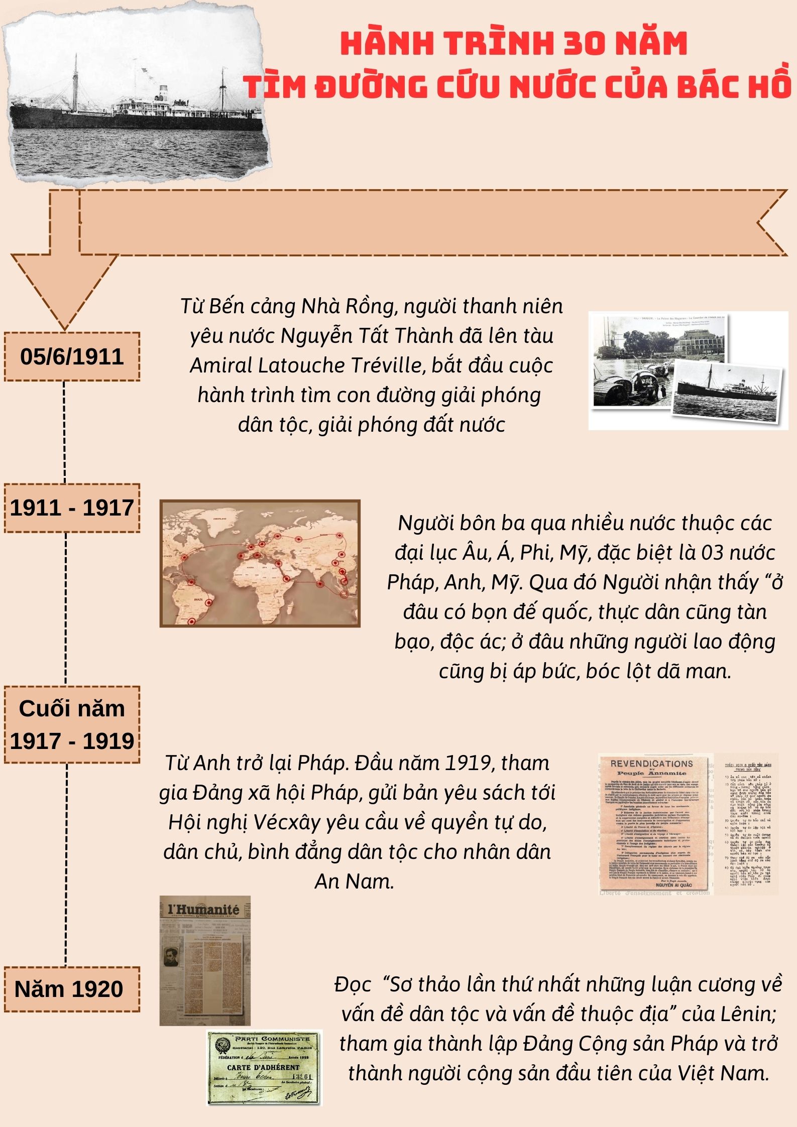 Ngày 5-6-1911, người thanh niên yêu nước Nguyễn Tất Thành - Văn Ba đã lên con tàu Amiral Latouche Tréville, từ Bến cảng Nhà Rồng, thành phố Sài Gòn đi Marseille (Pháp) với ý chí mãnh liệt và hoài bão sẽ tìm được con đường cứu nước, giải phóng hân dân khỏi ách nô lệ của thực dân, đế quốc.