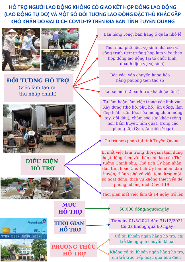Hỗ trợ người lao động không có giao kết hợp đồng lao động (lao động tự do) và một số đối tượng lao động đặc thù khác gặp khó khăn do đại dịch Covid-19 trên địa bàn tỉnh Tuyên Quang
