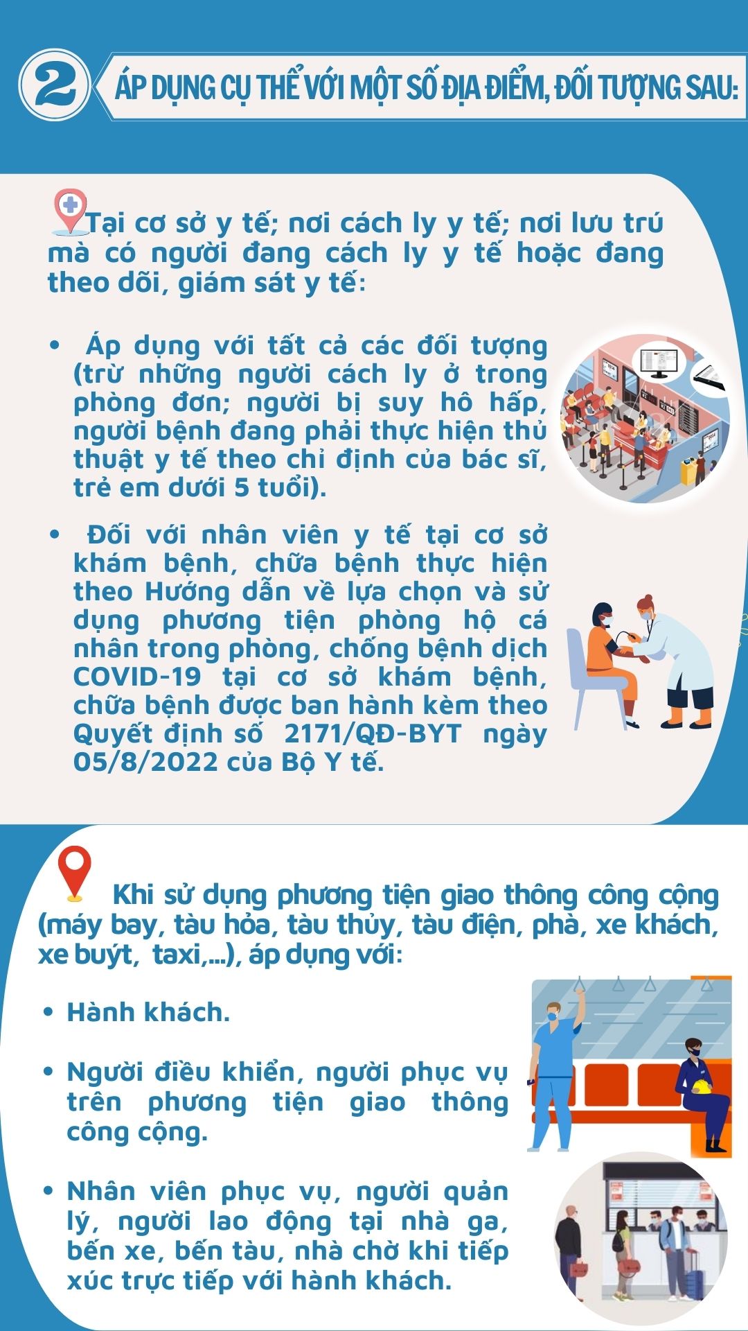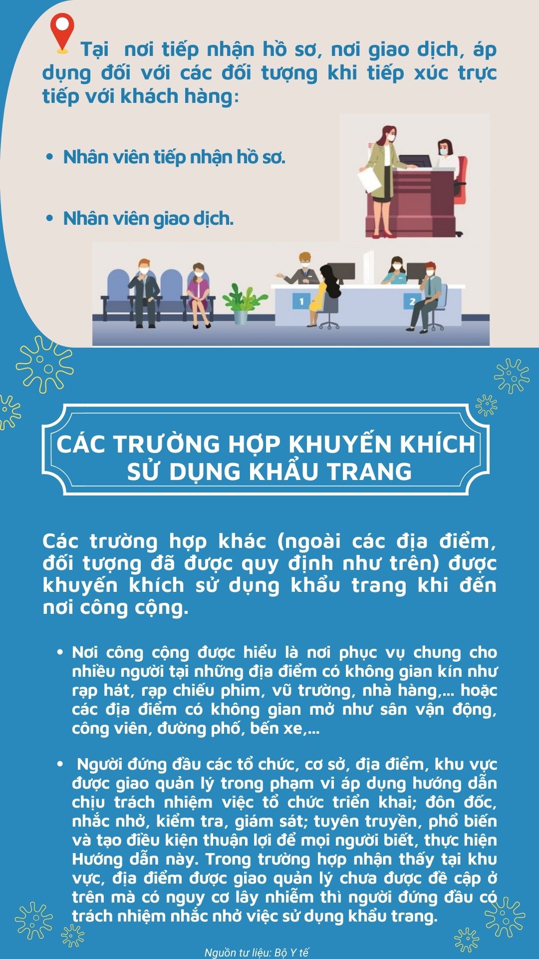Để thực hiện phòng, chống sự lây lan của dịch COVID-19 trong cộng đồng, đảm bảo thích ứng an toàn, linh hoạt, kiểm soát hiệu quả dịch bệnh trong tình hình mới. Ngày 06/9/2022, Bộ Y tế đã ban hành Quyết định số 2447/QĐ-BYT hướng dẫn sử dụng khẩu trang phòng, chống Covid-19 tại nơi công cộng; trong đó, chỉ rõ một số đối tượng, địa điểm bắt buộc phải đeo khẩu trang, người dân cần lưu ý để thực hiện.