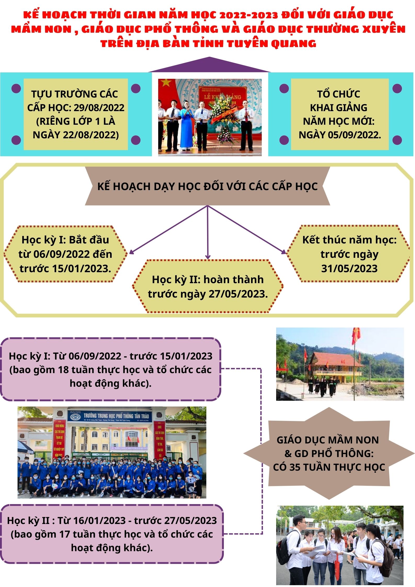 Ngày 18/8/2022 Ủy ban Nhân dân tỉnh Tuyên Quang ban hành Quyết định số 1147/QĐ-UBND về việc ban hành Kế hoạch thời gian năm học 2022-2023 đối với giáo dục mầm non, giáo dục phổ thông và giáo dục thường xuyên trên địa bàn tỉnh Tuyên Quang, cụ thể như sau: