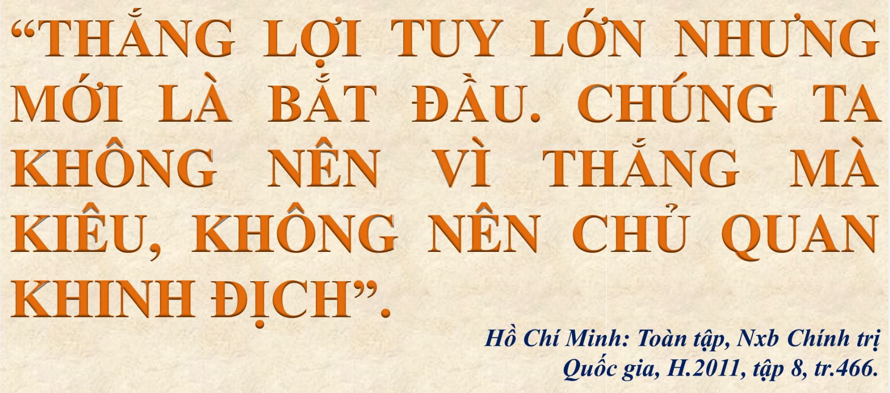 Khắc ghi lời dạy của Người, quân và dân ta luôn nêu cao tinh thần cảnh giác cách mạng, không chủ quan, khinh địch, không tự kiêu, tự đại với những chiến công và thành tích, đã viết tiếp vào trang sử vàng dân tộc một chiến thắng vĩ đại trưa ngày 30/4/1975, thu giang sơn về một mối, mở ra một kỷ nguyên mới cho dân tộc Việt Nam.