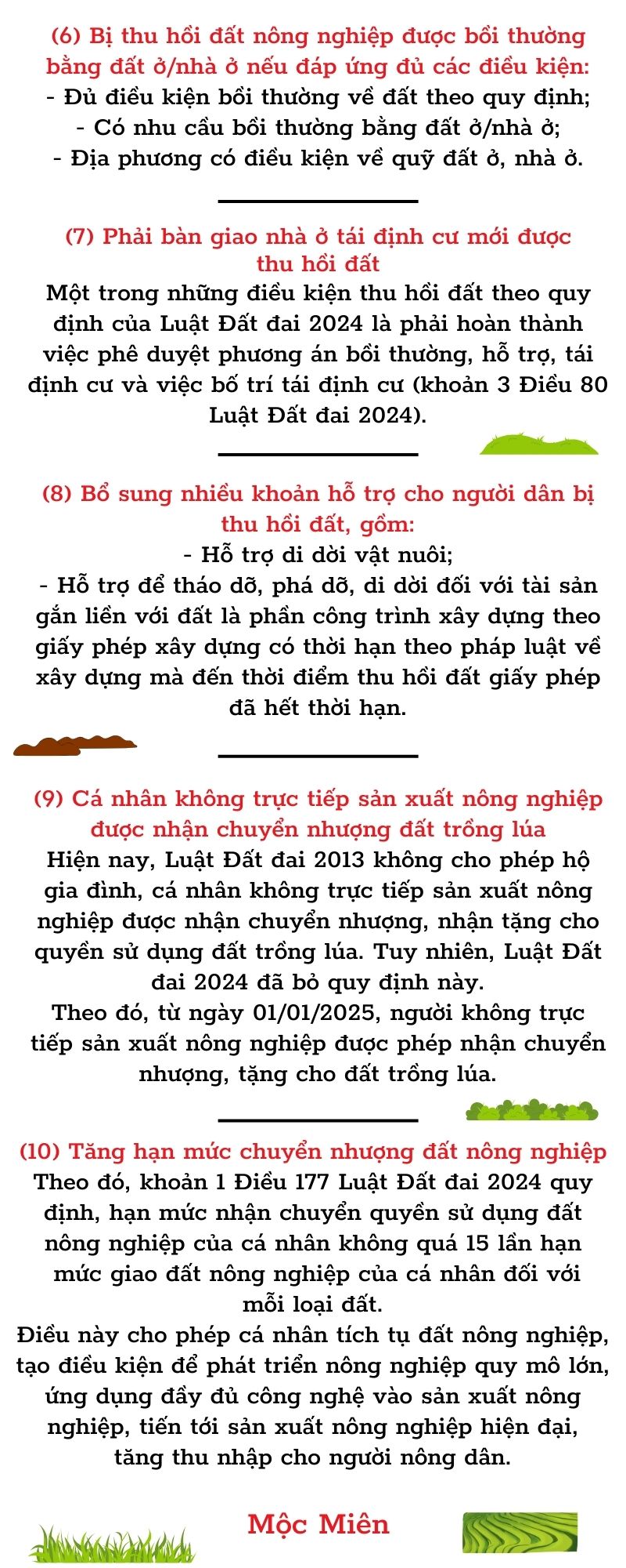 Luật Đất đai năm 2024 được Quốc hội khóa XV thông qua tại Kỳ họp bất thường lần thứ 5 và có hiệu lực từ ngày 01/01/2025 sẽ tác động sâu rộng tới mọi mặt xã hội cũng như mọi tầng lớp nhân dân. Dưới đây là điểm mới của Luật Đất đai năm 2024 có lợi cho hàng triệu người dân.