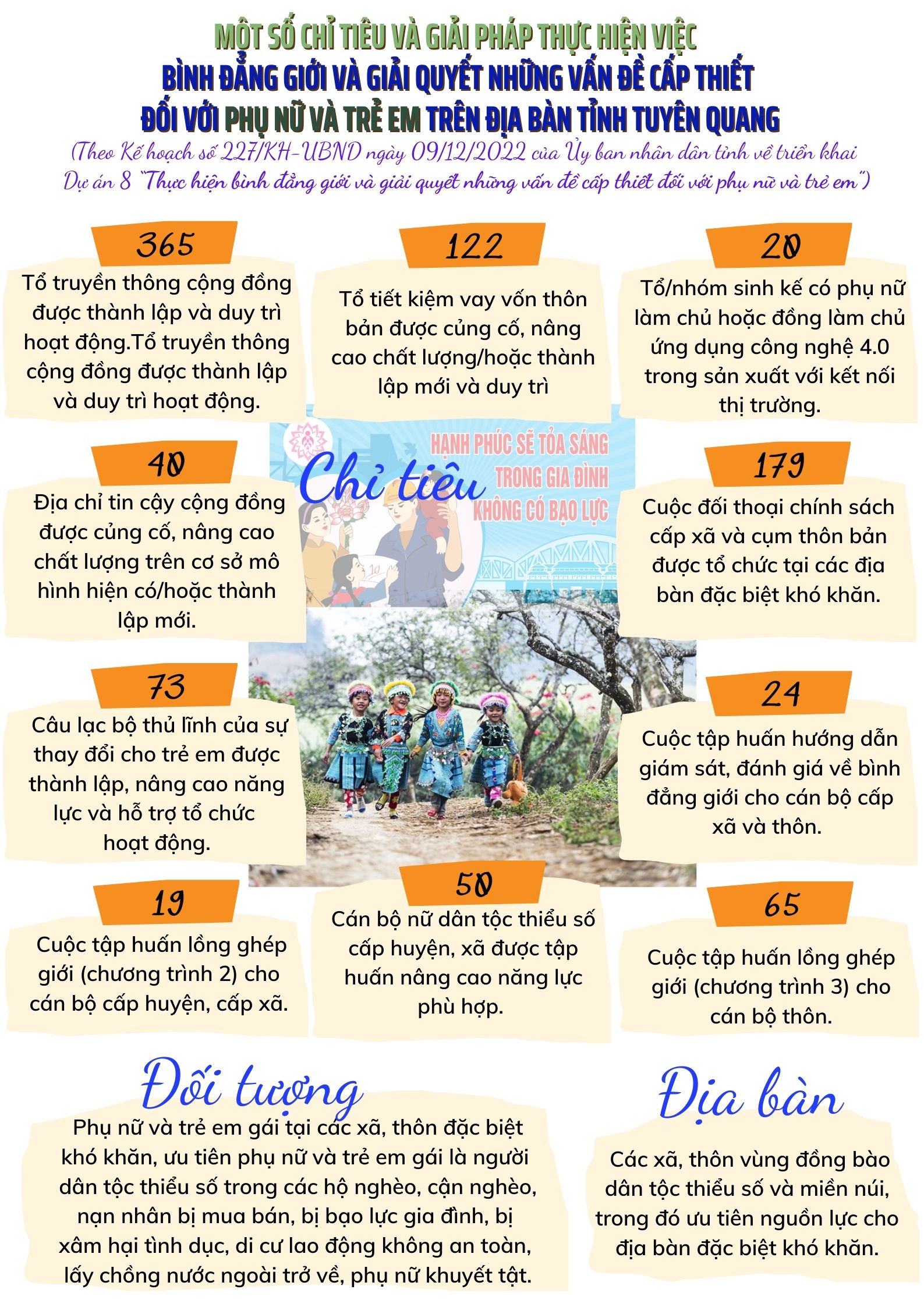 Ngày 09/12/2022 Ủy ban nhân dân tỉnh ban hành kế hoạch số 227/KH-UBND về triển khai Dự án 8 “Thực hiện bình đẳng giới và giải quyết những vấn đề cấp thiết đối với phụ nữ và trẻ em” thuộc Chương trình Mục tiêu quốc gia phát triển kinh tế - xã hội vùng đồng bào dân tộc thiểu số và miền núi giai đoạn 2021-2030 giai đoạn I: từ năm 2021 đến năm 2025 trên địa bàn tỉnh Tuyên Quang, cơ bản như sau: