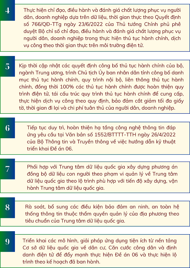 Thực hiện Chỉ thị số 04/CT-TTg ngày 11/02/2024 của Thủ tướng Chính phủ về việc tiếp tục đẩy mạnh triển khai Đề án phát triển ứng dụng dữ liệu về dân cư, định danh và xác thực điện tử phục vụ chuyển đổi số quốc gia giai đoạn 2022-2025, tầm nhìn đến năm 2030 tại các bộ, ngành, địa phương năm 2024 và những năm tiếp theo, ngày 29/02/2024 Ủy ban nhân dân tỉnh ban hành Văn bản số 706/UBND-NC với một số nhiệm vụ như sau: