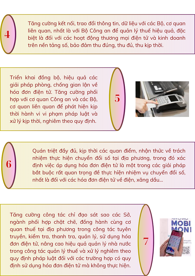Nhằm đẩy mạnh công tác quản lý, sử dụng hóa đơn điện tử, góp phần tạo lập môi trường kinh doanh bình đẳng, minh bạch và thuận lợi cho người dân, doanh nghiệp và thực hiện thành công Chiến lược chuyển đổi số quốc gia, cần thực hiện một số nhiệm vụ sau: