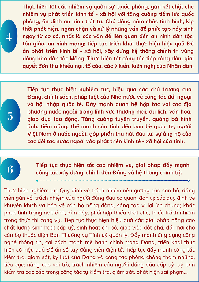 Năm 2024 là năm “tăng tốc”, có ý nghĩa quan trọng trong việc thực hiện thắng lợi Nghị quyết Đại hội đại biểu toàn quốc lần thứ XIII của Đảng, Nghị quyết Đại hội Đại biểu đảng bộ tỉnh lần thứ XVII; cùng với những thời cơ, thuận lợi, dự báo tình hình sẽ còn nhiều khó khăn, thách thức. Vì vậy, Ban Chấp hành Đảng bộ tỉnh yêu cầu các cấp uỷ Đảng, chính quyền, Mặt trận Tổ quốc và các tổ chức chính trị - xã hội cần tiếp tục phát huy tinh thần chủ động, nỗ lực, khắc phục khó khăn, phát huy tiềm năng, thế mạnh, sự vào cuộc của cả hệ thống chính trị và Nhân dân, tập trung thực hiện, phấn đấu đạt kết quả cao các chỉ tiêu, nhiệm vụ đã đề ra, trong đó tập trung lãnh đạo, chỉ đạo thực hiện tốt một số nhiệm vụ trọng tâm sau: