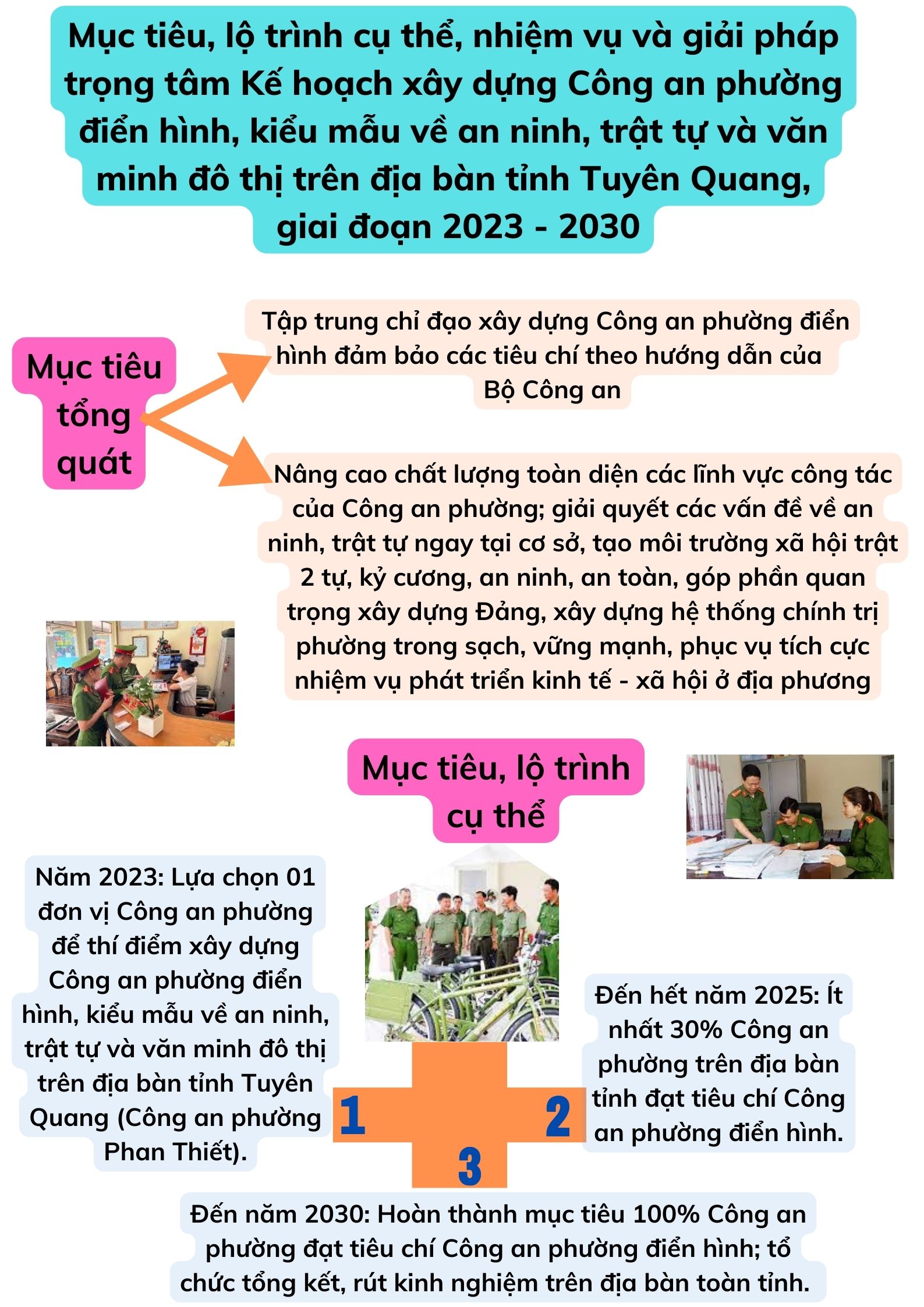 Mục tiêu, lộ trình cụ thể, nhiệm vụ và giải pháp trọng tâm Kế hoạch xây dựng Công an phường điển hình, kiểu mẫu về an ninh, trật tự và văn minh đô thị trên địa bàn tỉnh Tuyên Quang, giai đoạn 2023 - 2030