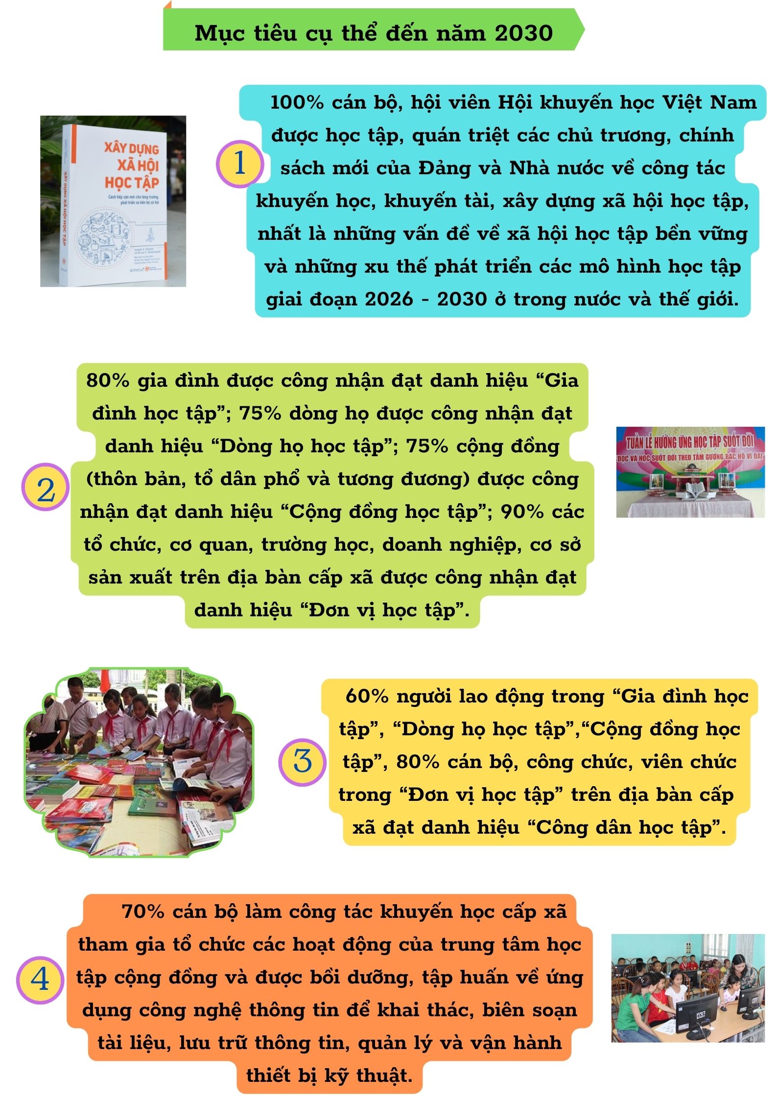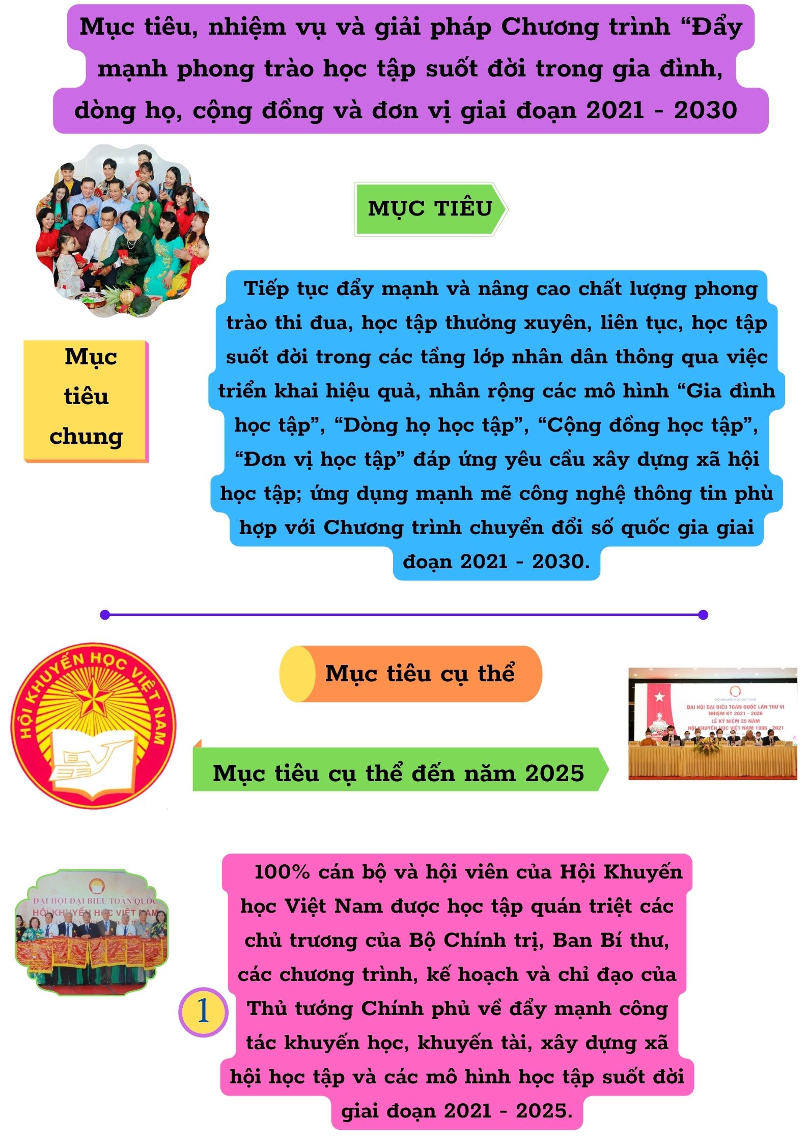 Ngày 25/3/2022, Thủ tướng Chính phủ đã ban hành Quyết định số 387/QĐ-TTg phê duyệt Chương trình "Đẩy mạnh phong trào học tập suốt đời trong gia đình, dòng học, cộng đồng, đơn vị giai đoạn 2021-2030" với mục tiêu, nhiệm vụ và giải pháp như sau: