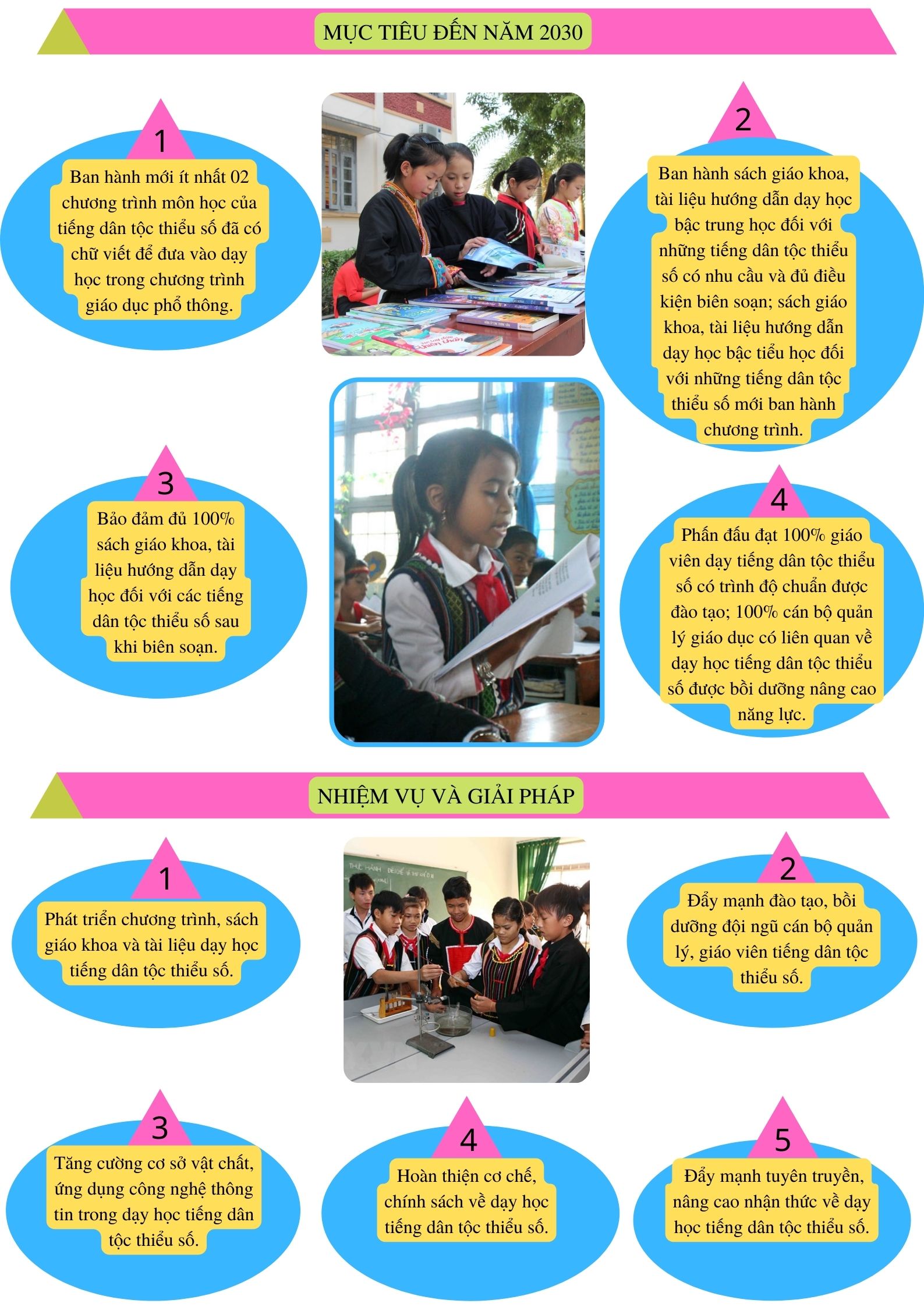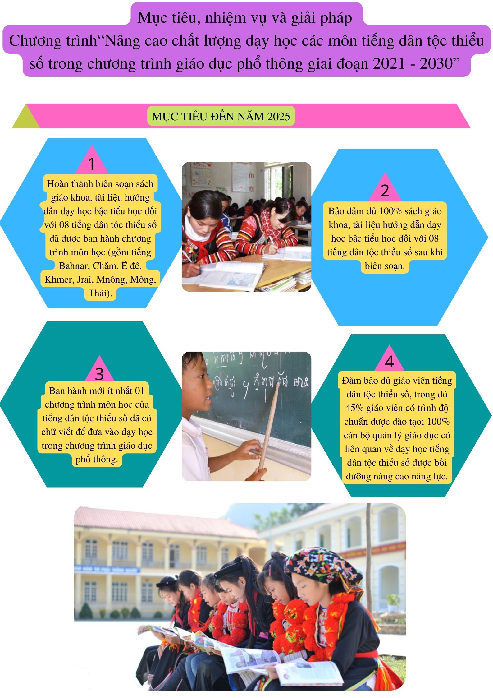 Ngày 27/01/2022, Thủ tướng Chính phủ đã ban hành Quyết định số 142/QĐ-TTg phê duyệt Chương trình "Nâng cao chất lượng dạy học các môn tiếng dân tộc thiểu số trong chương trình giáo dục phổ thông giai đoạn 2021 - 2030" với mục tiêu, nhiệm vụ và giải pháp, như sau: