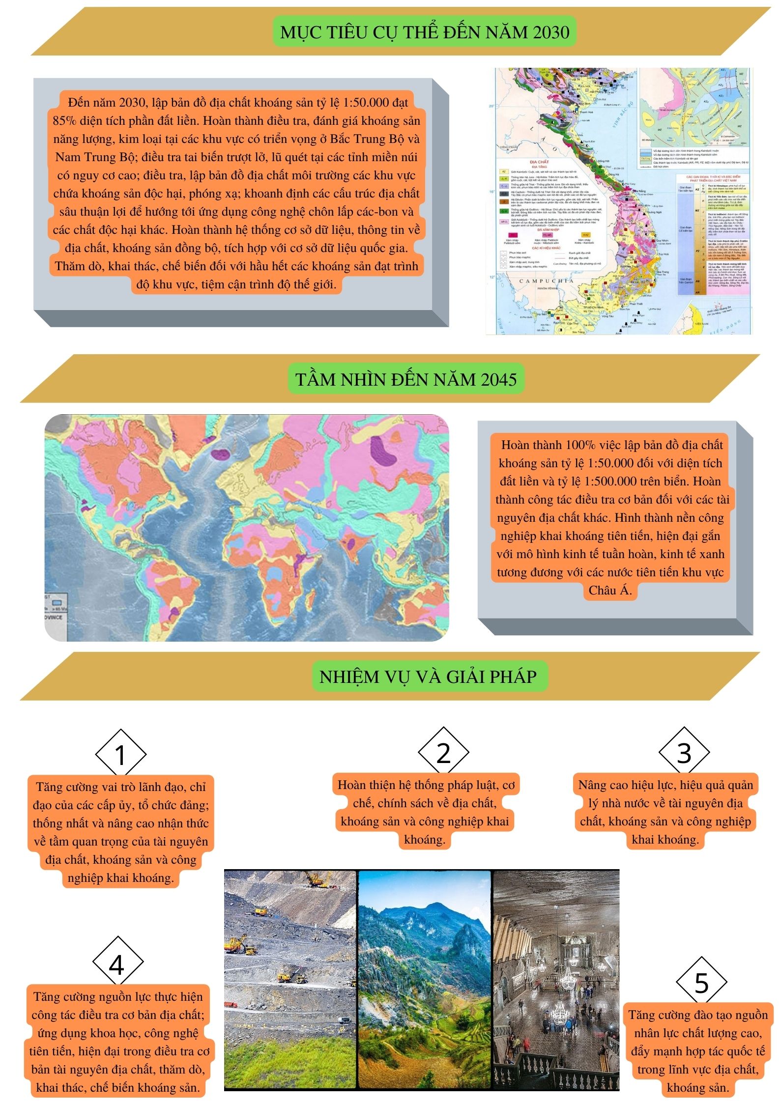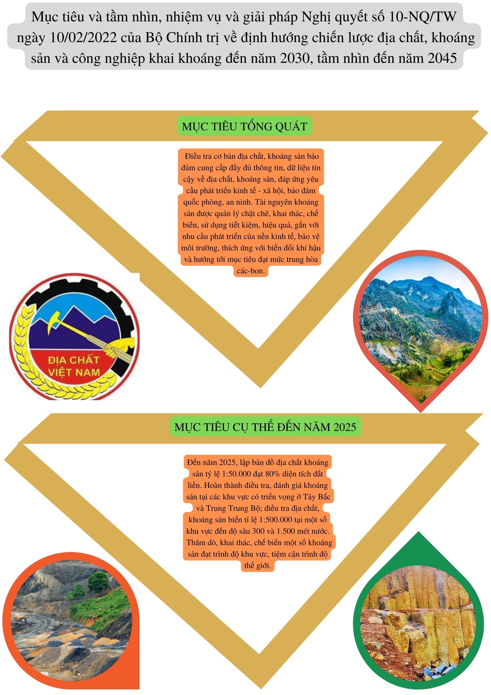 Ngày 10/02/2022, Bộ Chính trị đã ban hành Nghị quyết số 10-NQ/TW về định hướng chiến lược địa chất, khoáng sản và công nghiệp khai khoáng đến năm 2030, tầm nhìn đến năm 2045 với mục tiêu và tầm nhìn, nhiệm vụ và giải pháp như sau: