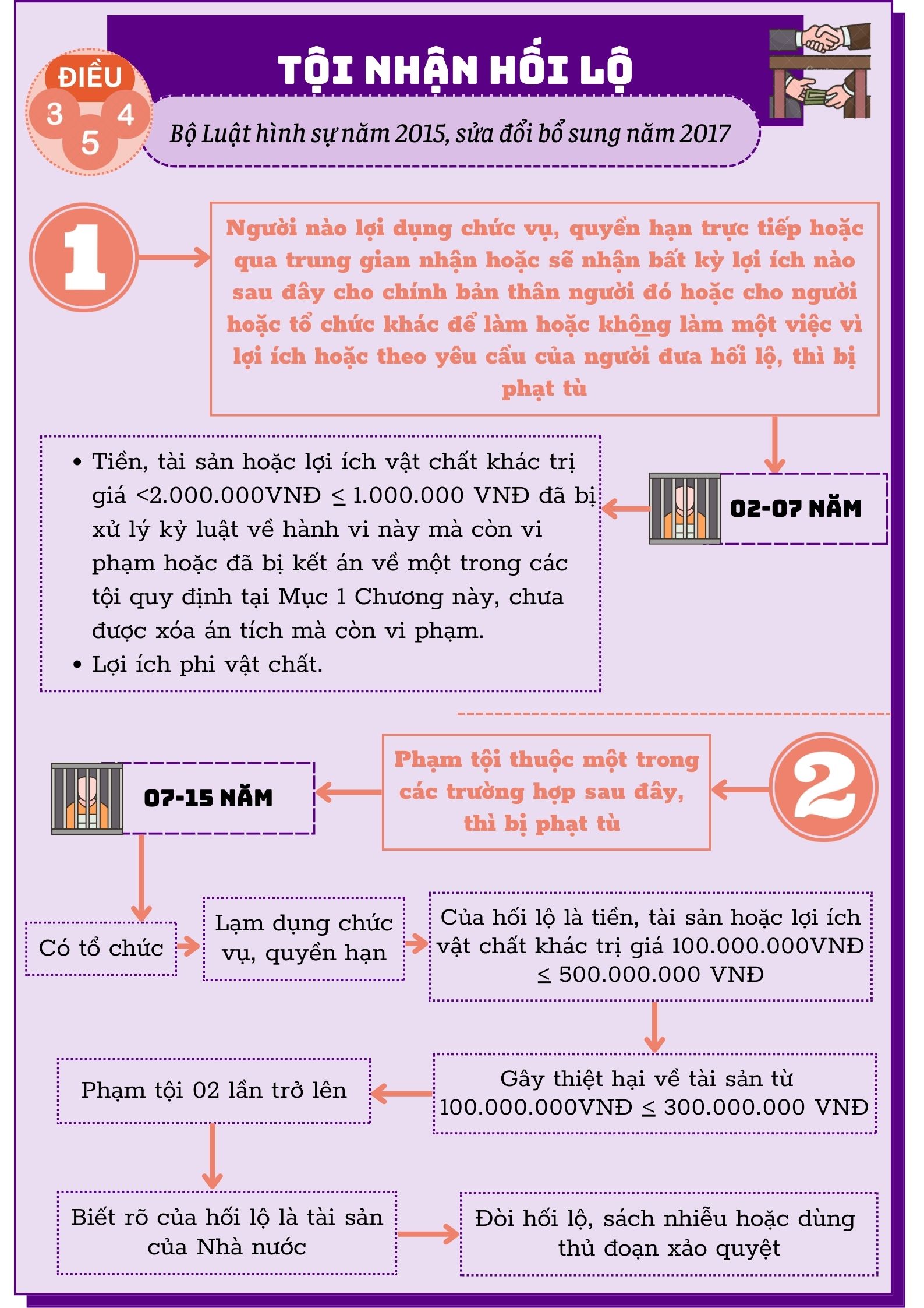Điều 354 Bộ Luật hình sự năm 2015, sửa đổi bổ sung năm 2017 quy định mức xử phạt đối với tội nhận hối lộ, cụ thể như sau: