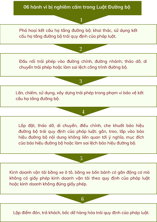 Ngày 27/6/2024, Quốc hội ban hành Luật số 35/2024/QH15 về Luật Đường bộ, với nguyên tắc hoạt động và 06 hành vi bị nghiêm cấm trong Luật Đường bộ tại điều 3 và điều 7 như sau: