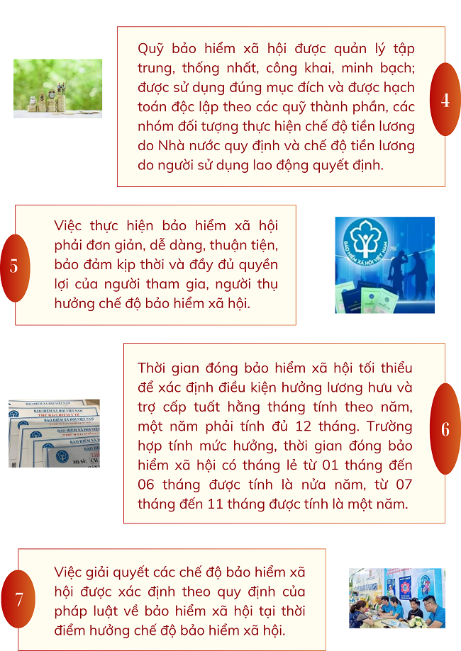 Ngày 29/6/2024, Quốc hội ban hành Luật số 41/2024/QH15 Luật Bảo hiểm xã hội, trong đó Điều 5 "Nguyên tắc bảo hiểm xã hội", quy định những người tham gia bảo hiểm xã hội phải thực hiện theo nguyên tắc sau: