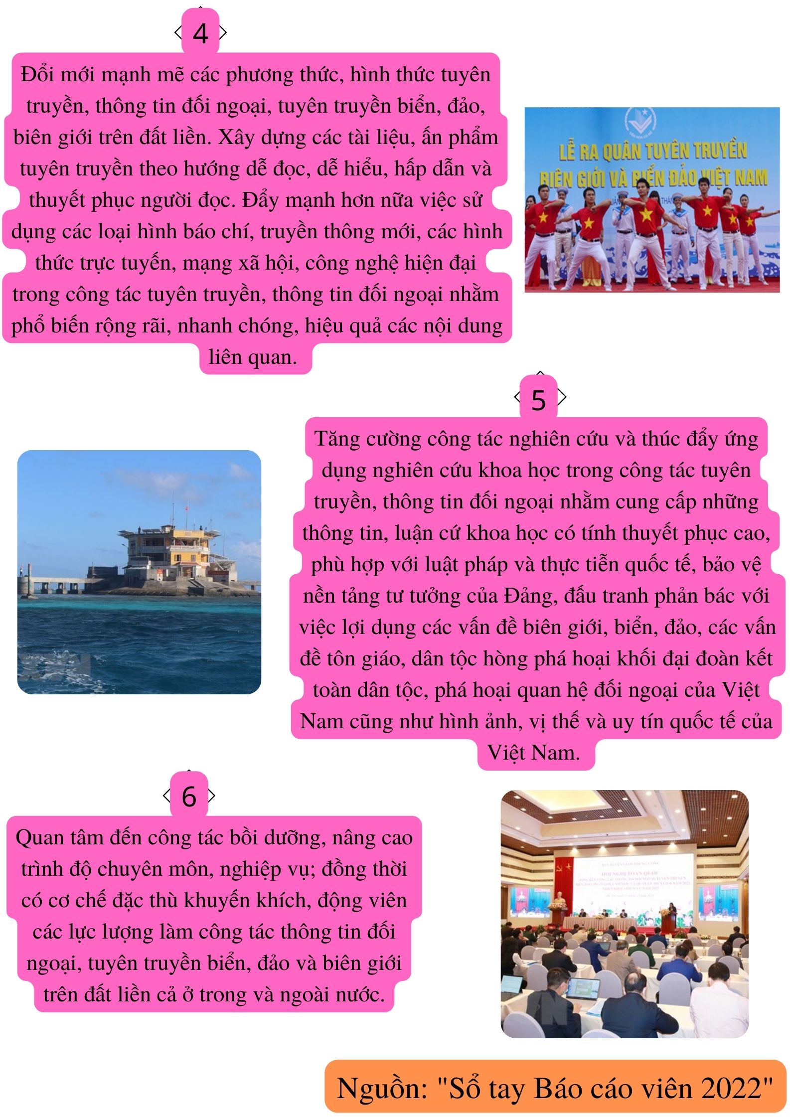 Để tiếp tục đổi mới, nâng cao chất lượng công tác thông tin đối ngoại; tuyên truyền biển, đảo và phân giới, cắm mốc, quản lý biên giới, năm 2022 cần tập trung vào 06 nhiệm vụ, giải pháp chủ yếu sau đây: