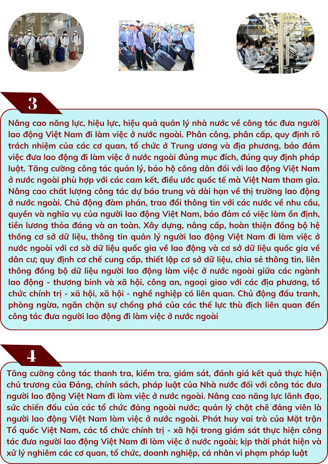 Ngày 12/12/2022, Ban Bí thư Trung ương Đảng ban hành Chỉ thị số 20-CT/TW về tăng cường sự lãnh đạo của Đảng đối với công tác đưa người lao động Việt Nam đi làm việc ở nước ngoài trong tình hình mới với nhiệm vụ trọng tâm như sau: