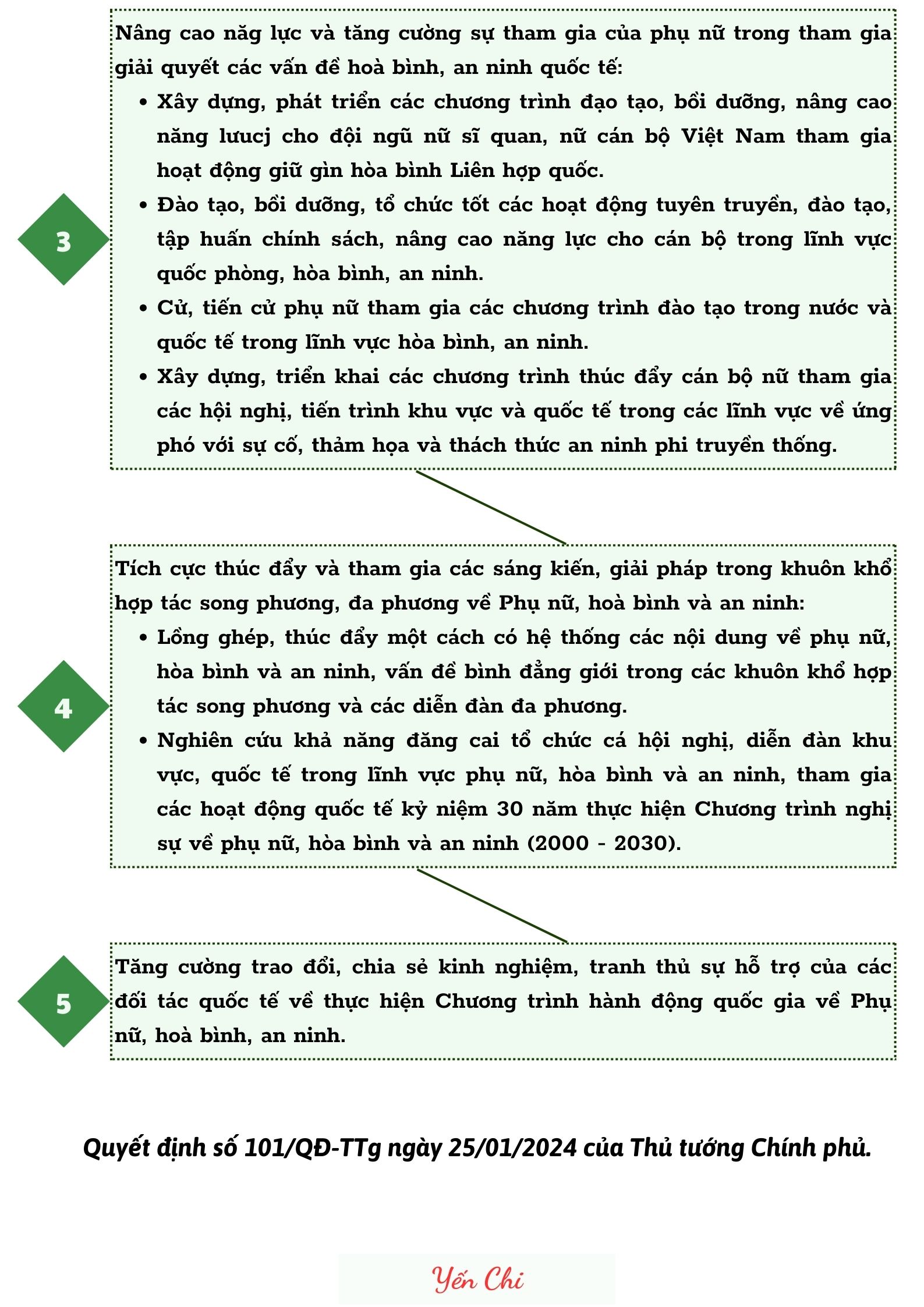 Ngày 25/01/2024 Thủ tướng Chính phủ ban hành Quyết định số 101/QĐ-TTg phê duyệt Chương trình hành động quốc gia về Phụ nữ, hòa bình và an ninh giai đoạn 2024 - 2030, trong đó nhiệm vụ và giải pháp như sau:
