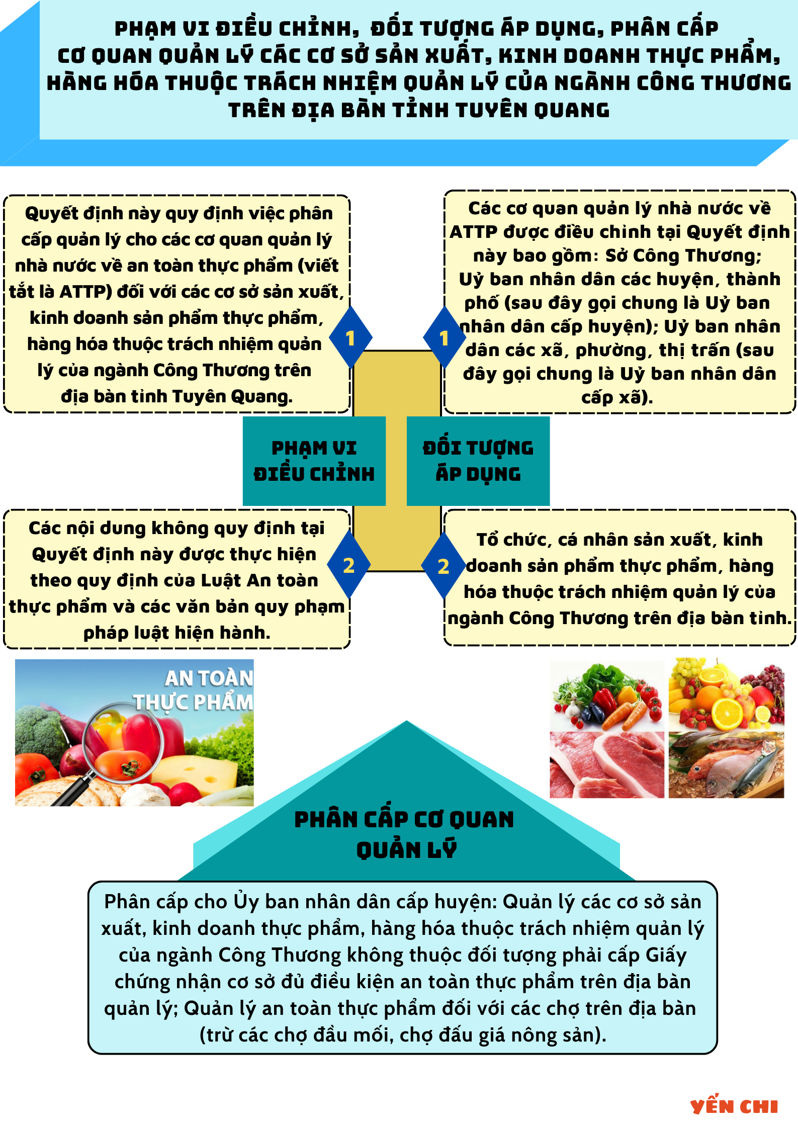 Ngày 07/9/2022 Ủy ban Nhâ dân tỉnh Tuyên Quang ban hành Quyết định số 30/QĐ-UBND về Phân cấp quản lý nhà nước về an toàn thực phẩm đối với các cơ sở sản xuất, kinh doanh sản phẩm thực phẩm, hàng hóa thuộc trách nhiệm quản lý của ngành Công Thương trên địa bàn tỉnh Tuyên Quang, gồm phạm vi điều chỉnh, đối tượng áp dụng, phân cấp cơ quan quản lý cụ thể như sau: