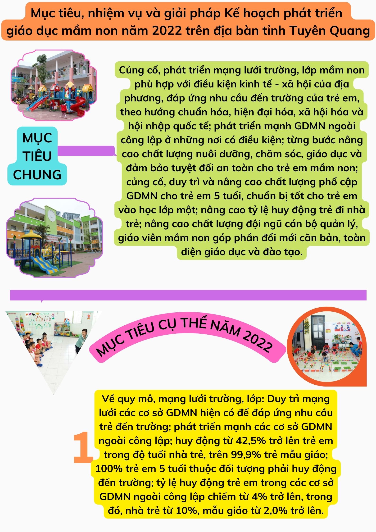 Ngày 13/4/2022, Ủy ban Nhân dân tỉnh đã ban hành Kế hoạch số 56-KH/UBND về phát triển giáo dục mầm non năm 2022 trên địa bàn tỉnh Tuyên Quang với mục tiêu, nhiệm vụ và giải pháp như sau: