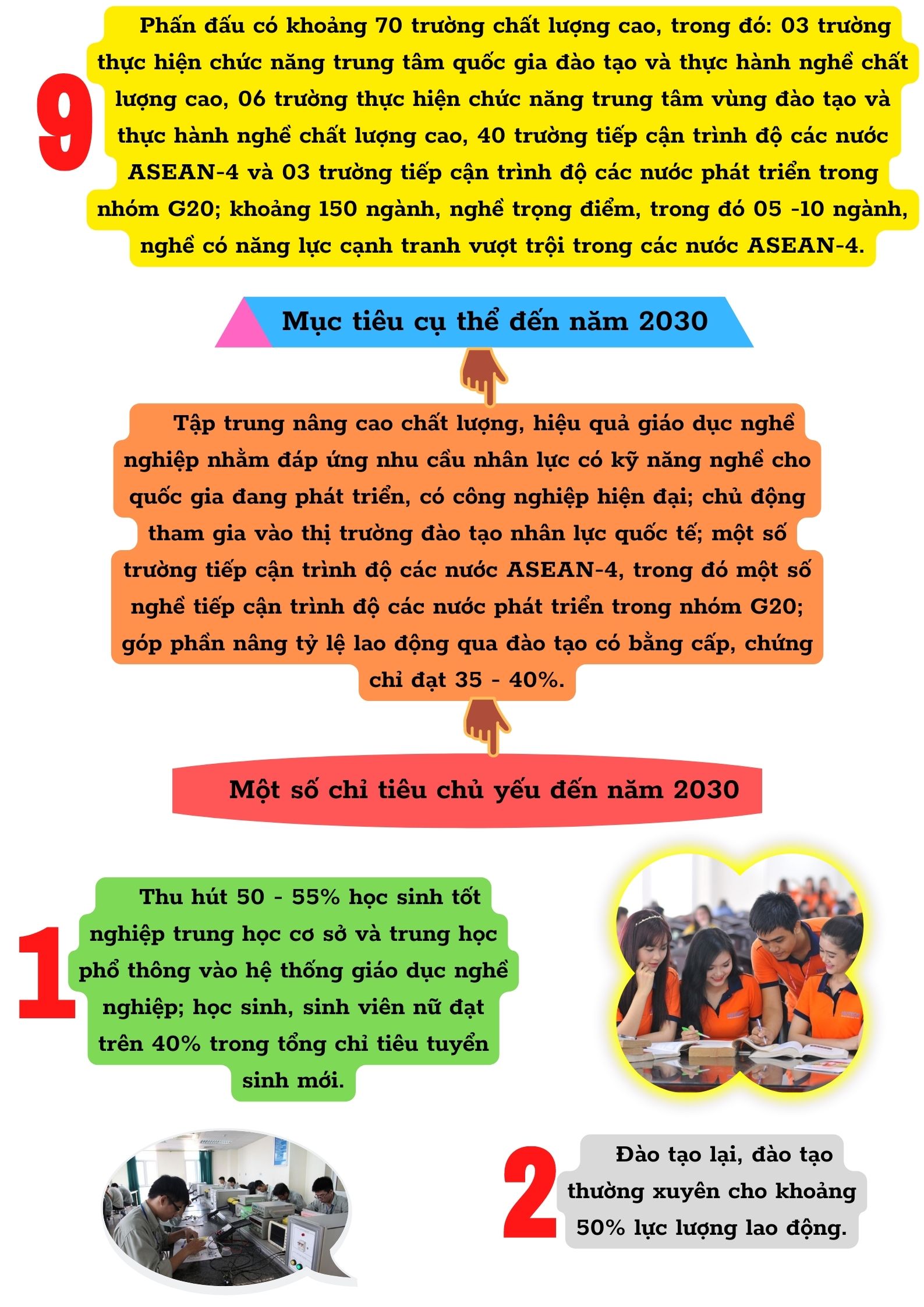 Ngày 30/12/2021, Thủ tướng Chính phủ đã ban hành Quyết định số 2239/QĐ-TTg phê duyệt Chiến lược phát triển giáo dục nghề nghiệp giai đoạn 2021 - 2030, tầm nhìn đến năm 2045 với quan điểm, mục tiêu như sau: