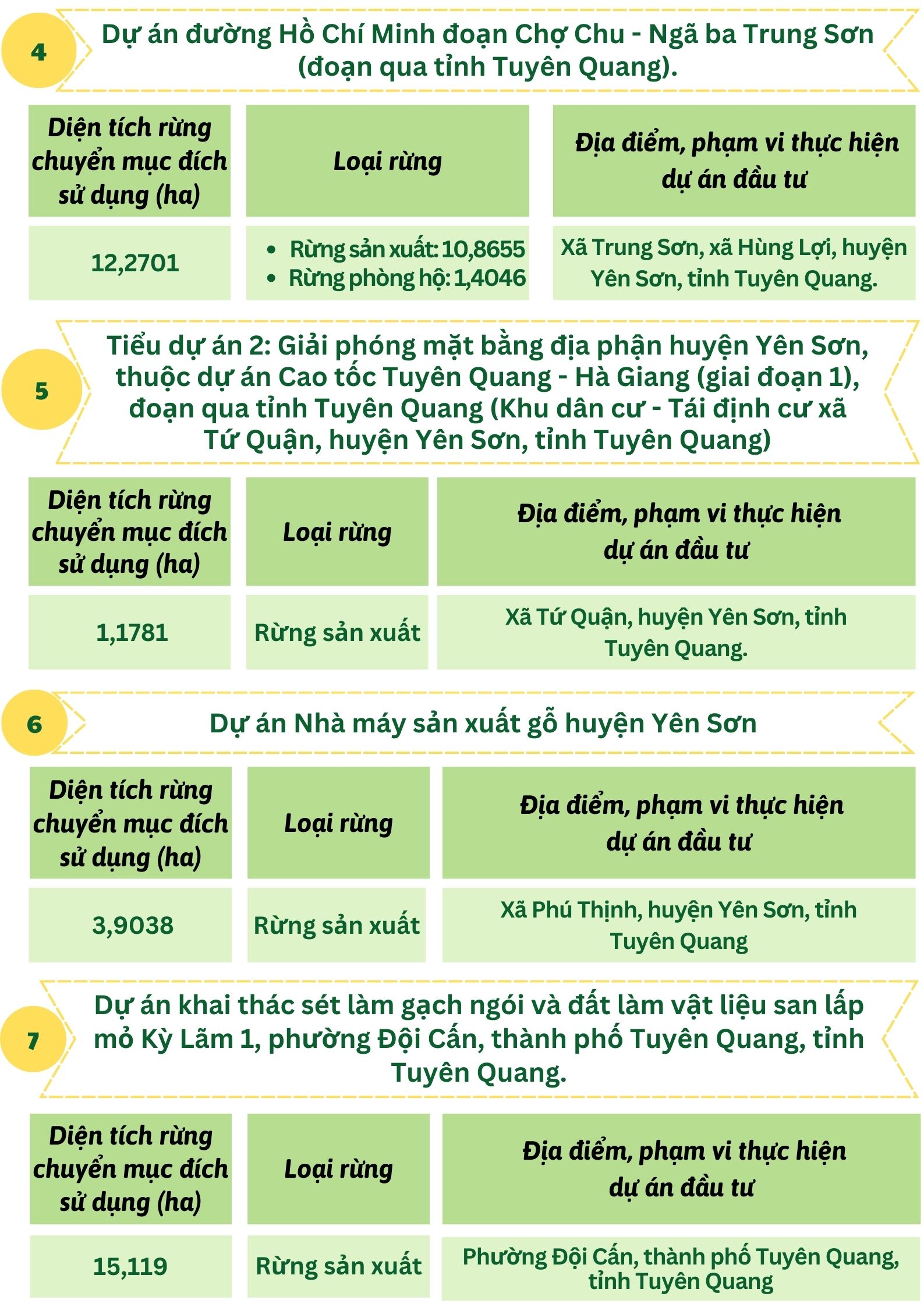 Ngày 07/12/2023 Hội đồng nhân dân tỉnh Tuyên Quang ban hành Nghị quyết số 60/2023/NQ-HĐND Quy định chủ trương chuyển đổi mục đích sử dụng rừng sang mục đích khác để thực hiện 07 dự án trên địa bàn tỉnh Tuyên Quang cụ thể như sau: