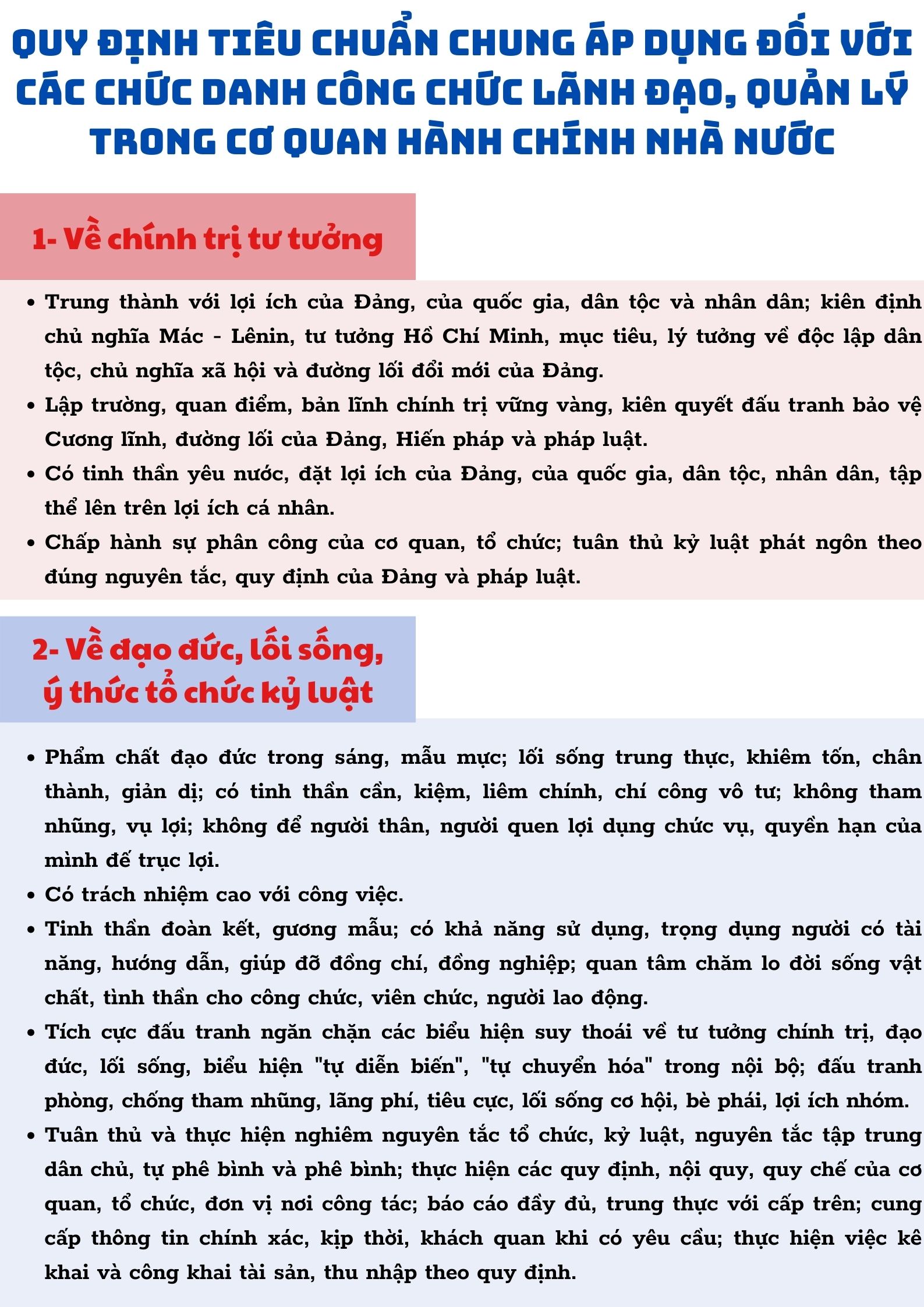 Ngày 06/3/2024 chính phủ ban hành Nghị định số 29/2024/NĐ-CP quy định tiêu chuẩn chung áp dụng đối với các chức danh công chức lãnh đạo, quản lý trong cơ quan hành chính nhà nước (có hiệu lực thi hành từ ngày 01/5/2024), trong đó quy định tiêu chuẩn như sau:
