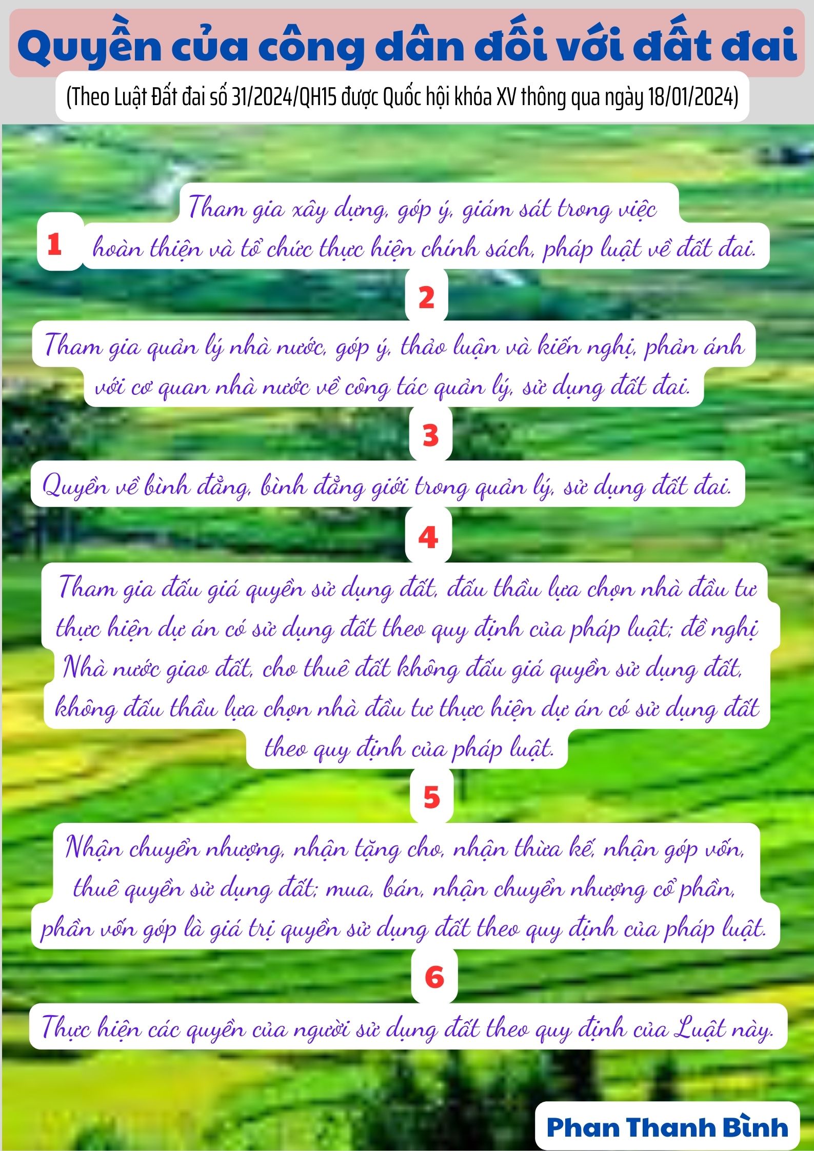 Luật Đất đai được Quốc hội thông qua ngày 18/01/2024, có hiệu lực kể từ ngày 01/01/2025 quy định quyền của công dân đối với đất đai, như sau: