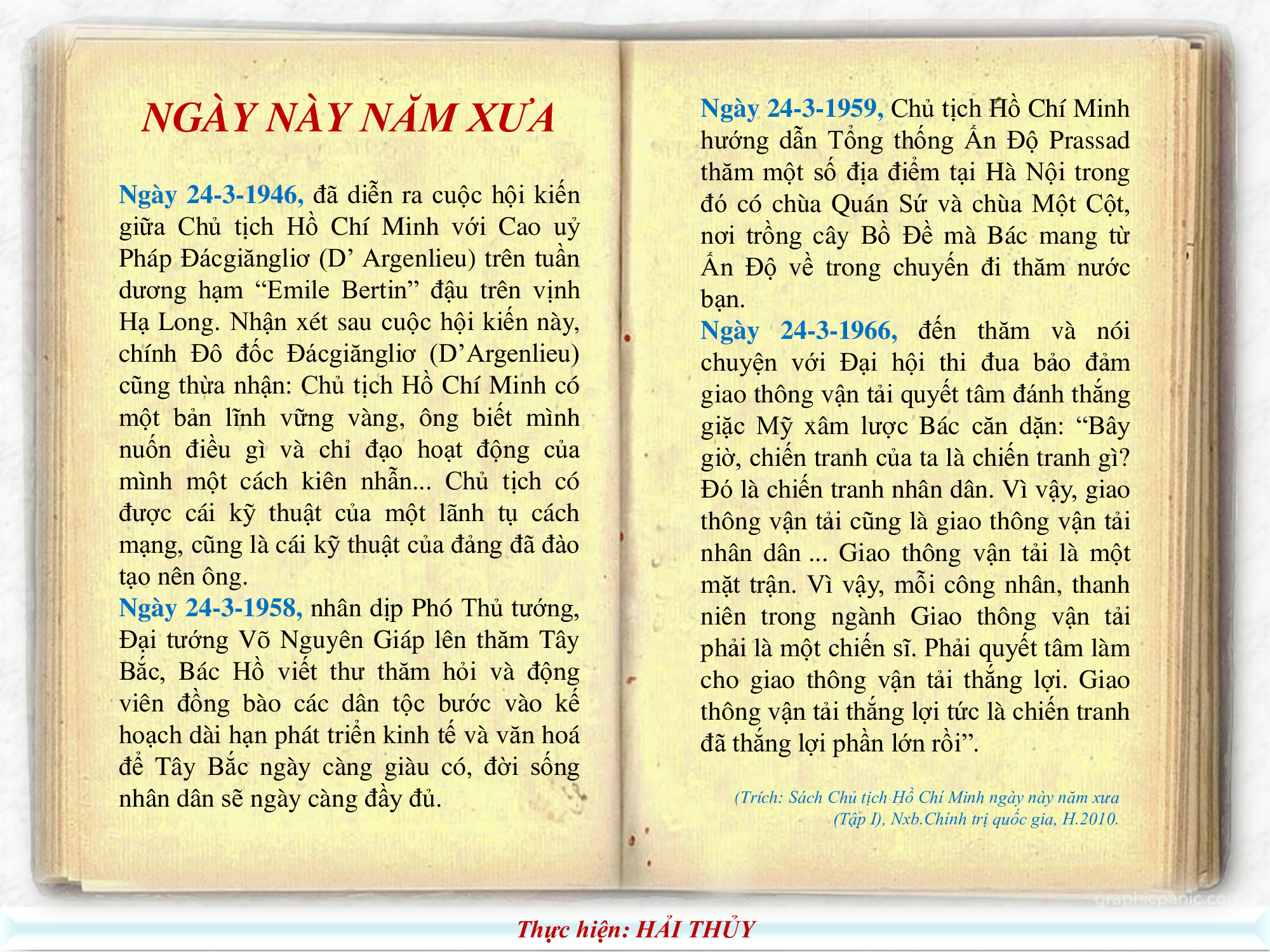 Trong bài nói chuyện, Người nhắc nhở "Hiện nay, nhiệm vụ của thanh niên là ra sức giúp Đảng xây dựng chủ nghĩa xã hội ở miền Bắc, làm nền tảng vững mạnh cho công cuộc đấu tranh thực hiện hòa bình thống nhất nước nhà... Muốn làm tròn nhiệm vụ vẻ vang ấy, thanh niên ta cần phải thấm nhuần tinh thần làm chủ nước nhà và phải trau dồi đạo đức của người cách mạng".
