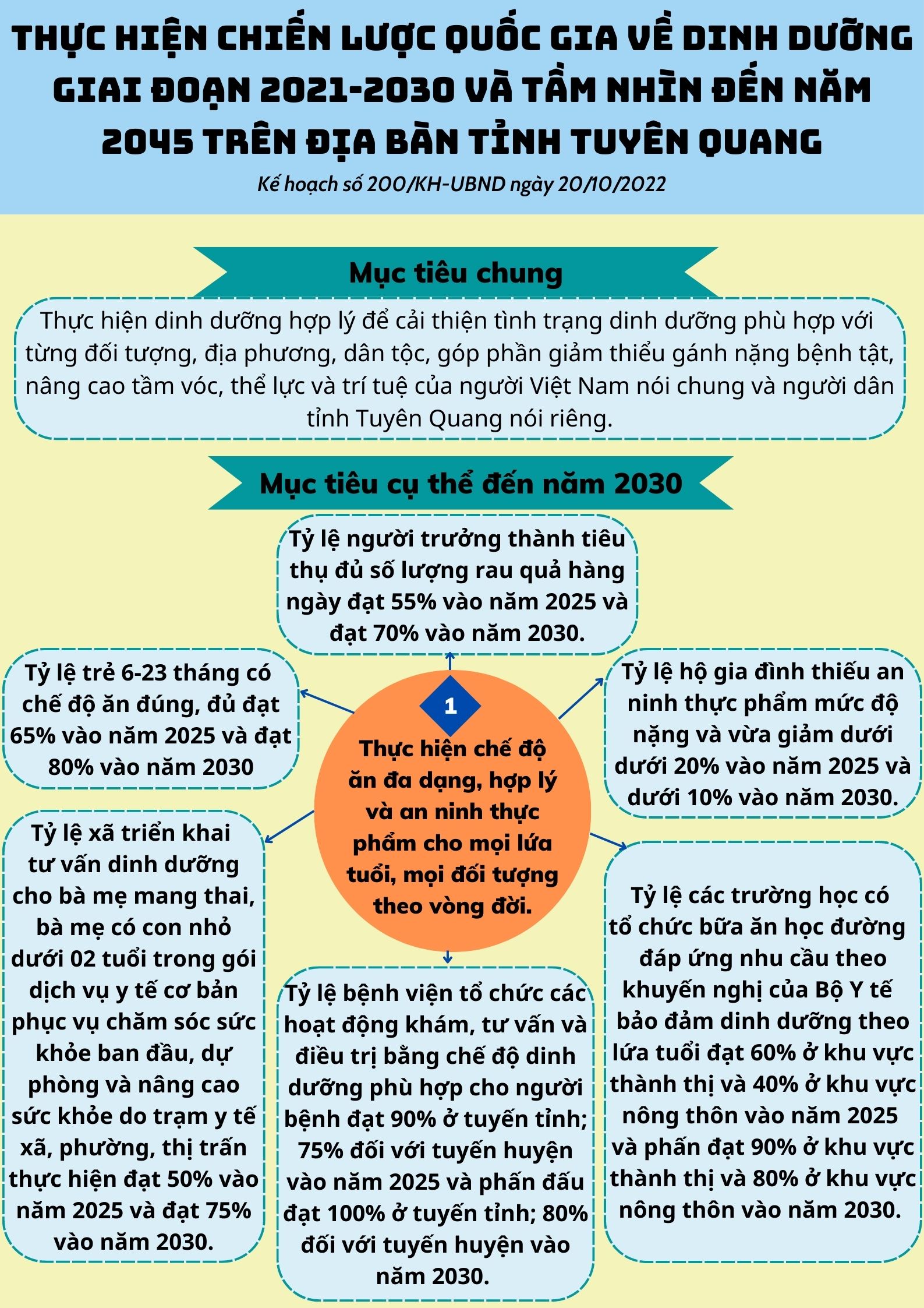 Ngày 20/10/2022 Ủy ban Nhân dân tỉnh Tuyên Quang ban hành Kế hoạch số 200/KH-UBND về thực hiện Chiến lược quốc gia về dinh dưỡng giai đoạn 2021-2030 và tầm nhìn đến năm 2045 trên địa bàn tỉnh Tuyên Quang với các mục tiêu cụ thể như sau: