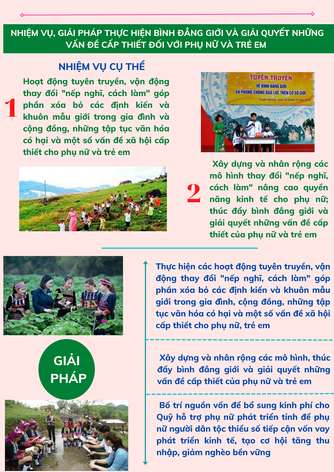 Để thực hiện tốt các nhiệm vụ chăm sóc sức khỏe, bình đẳng giới và giải quyết những vấn đề cấp thiết đối với phụ nữ, trẻ em vùng đồng bào dân tộc thiểu số và miền núi trên địa bàn tỉnh, ngày 06/9/2021 Ủy Ban nhân dân tỉnh đã ban hành Kế hoạch số 147/KH-UBND với nhiệm vụ, giải pháp thực hiện năm 2021 cụ thể: