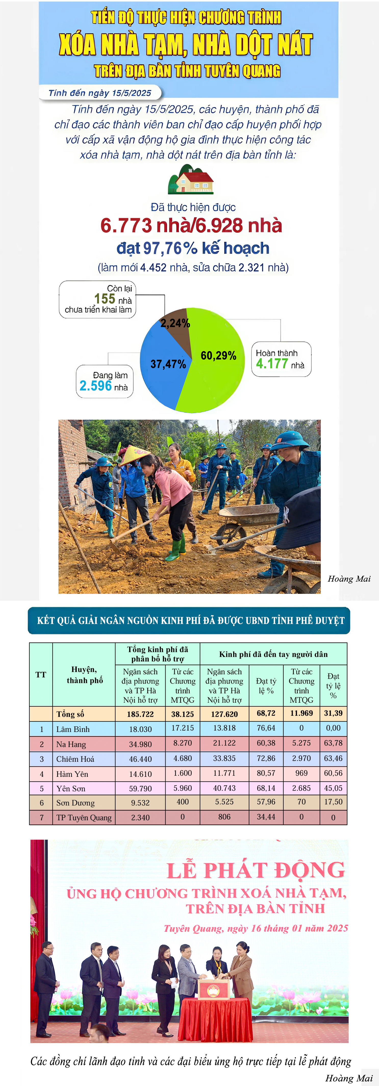 Theo Báo cáo số 07/BC-TGVBCĐ ngày 16/5/2025 của Tổ giúp việc Ban Chỉ đạo triển khai xoá nhà tạm,  nhà dột nát tỉnh Tuyên Quang, tiến độ thực hiện hỗ trợ xoá nhà tạm, nhà dột nát trên địa bàn tỉnh Tuyên Quang như sau: Tính đến ngày 15/5/2025, tổng số nhà đã khởi công, đang xây dựng và nhà đã hoàn thành đưa vào sử dụng là: 6.773 hộ/6.928 hộ, đạt 97,8% kế hoạch (làm mới 4.452 hộ, sửa chữa 2.321 hộ). Trong đó, số hộ hoàn thành: 4.177 căn, số hộ đang làm 2.596 căn, còn 155 hộ chưa triển khai thực hiện.