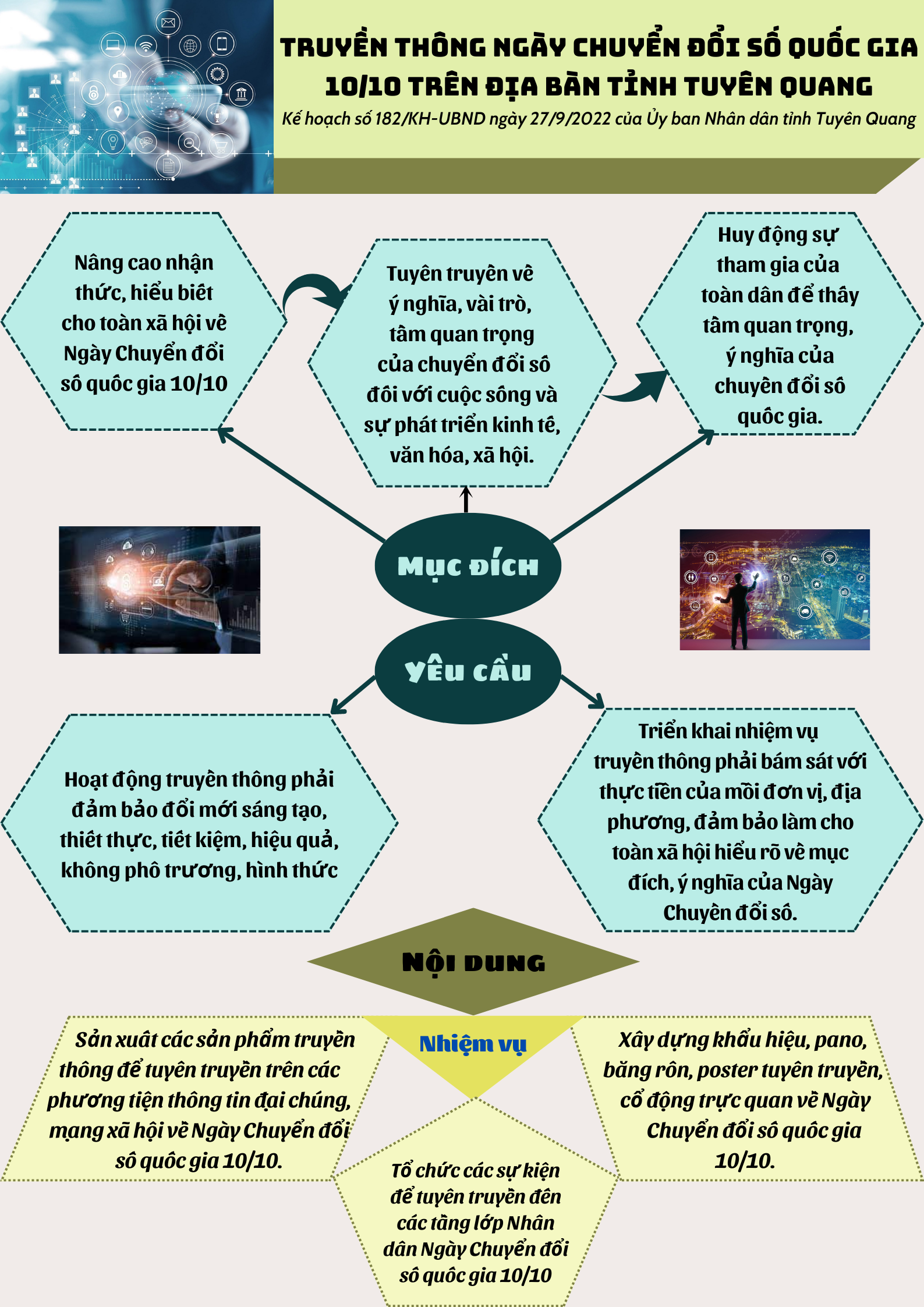 Ngày 27/9/2022 Ủy ban Nhân dân tỉnh Tuyên Quang ban hành Kế hoạch 182-KH/UBND về Truyền thông Ngày Chuyển đổi số quốc gia 10/10 trên địa bàn tỉnh Tuyên Quang năm 2022 với mục đích, yêu cầu, nội dung, cụ thể như sau: