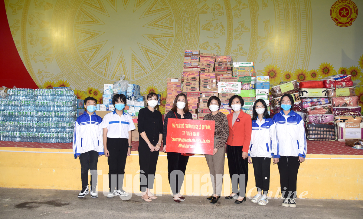 Trong đó, HĐND, UBND, Ủy ban MTTQ huyện Chiêm Hóa trao hỗ trợ 100 triệu đồng; Mặt trận Tổ quốc huyện Hàm Yên đã tiếp nhận và trao 8 tấn nông sản, cùng các vật dụng thiết yếu gồm: 5 tấn cam; 1 tấn gạo; 2 tấn rau, bí, khoai tây; cùng các vật dụng khác như xô, chậu, cốc… tổng trị giá 73,6 triệu đồng; trường THCS Lê Quý Đôn (TP Tuyên Quang) ủng hộ hơn 400 hộp khẩu trang, gần 200 chăn ấm và gối, 96 thùng mì tôm, 82 thùng nước lọc và nhu yếu phẩm thiết yếu khác như: dung dịch sát khuẩn, dầu ăn, bột canh, bột mì, gạo, bánh kẹo... tổng giá trị hơn 100 triệu đồng.