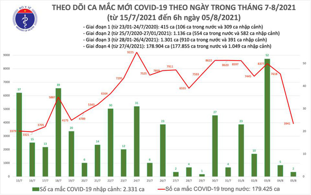 - Tính đến sáng ngày 04/8, Việt Nam có 181.756 ca nhiễm trong đó có 2.331 ca nhập cảnh và 179.425 ca mắc trong nước.