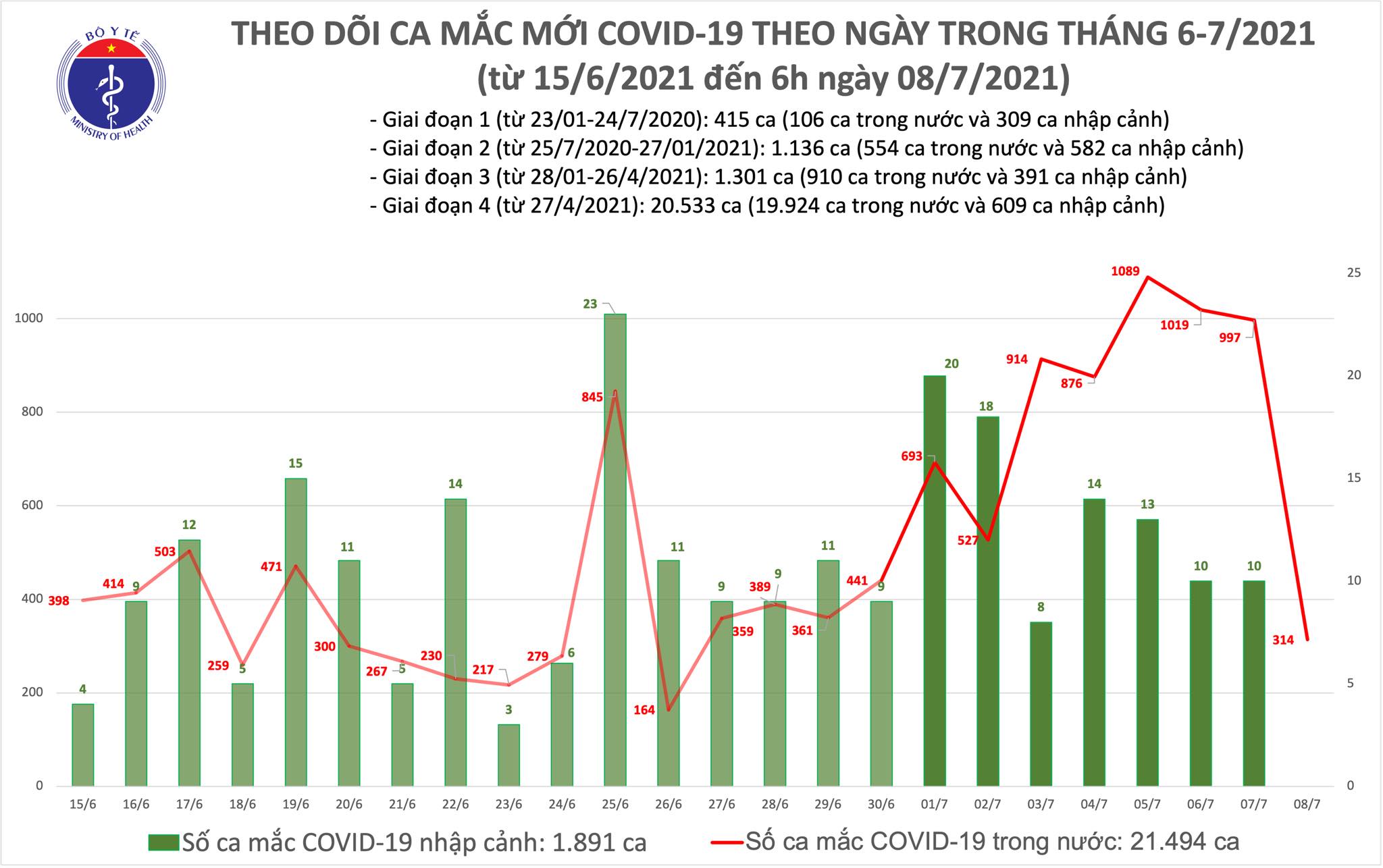 Tính từ 19h30 ngày 07/7 đến 6h ngày 08/7 có 314 ca mắc mới (BN23072-23385):